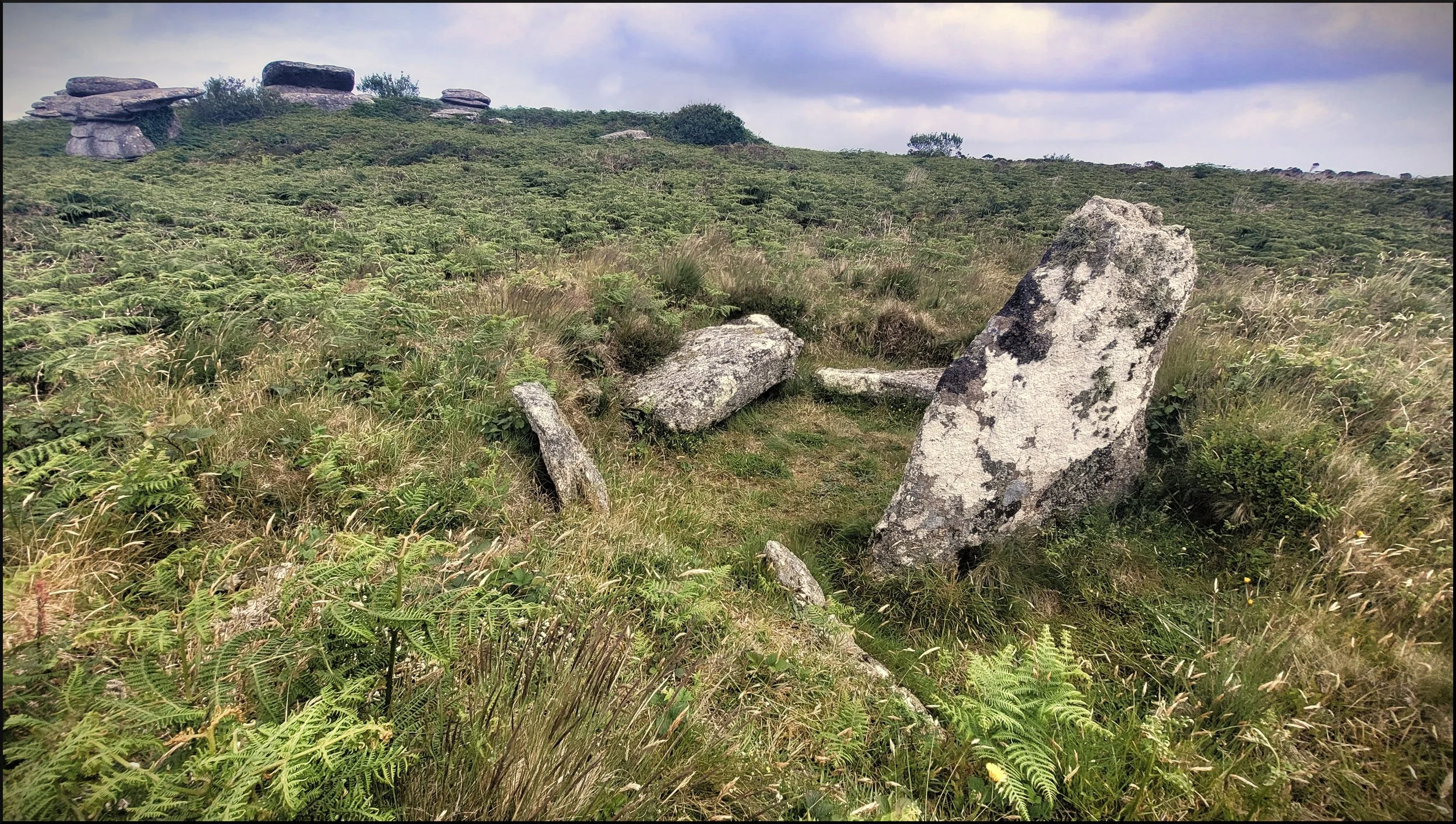 A single upright stands like a gravestone amongst the fallen four with a long since grounded capstone prostrate and beyond repair. Who laid here, miner or master ?