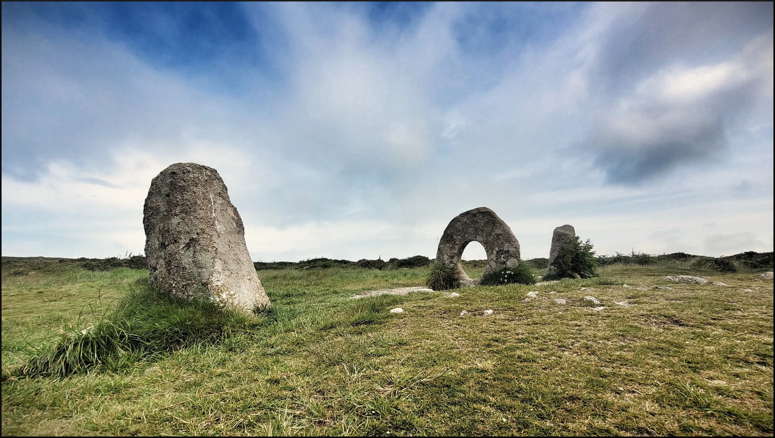 On the western edge of my circle is the peculiar Men An Tol, a donut shaped stone on it’s side with two flanker uprights and a number of fallen stones hinting at a one time large circle complex. The donut stone’s hole is smooth and almost perfectly formed, so was it natural, skilfully sculpted or worn by the passage of small children through it ? Stories go that children were placed through the hole to cure them of rickets and tuberculosis. This medical phenomenon also stretched to the cure of orthopaedic issues and infertility in adults. Looking at the size of the hole it seemed unlikely that a fully grown adult would get through it without getting stuck. A couple arrived as I was there and I waited for one of them to prove me wrong. I was left disappointed but they did take photos using the hole as a frame much like a fairground ‘peep board’. Then my mind wandered to the tradition of ‘Gurning’ in the small Cumbrian town of Egremont, but lets not go there !