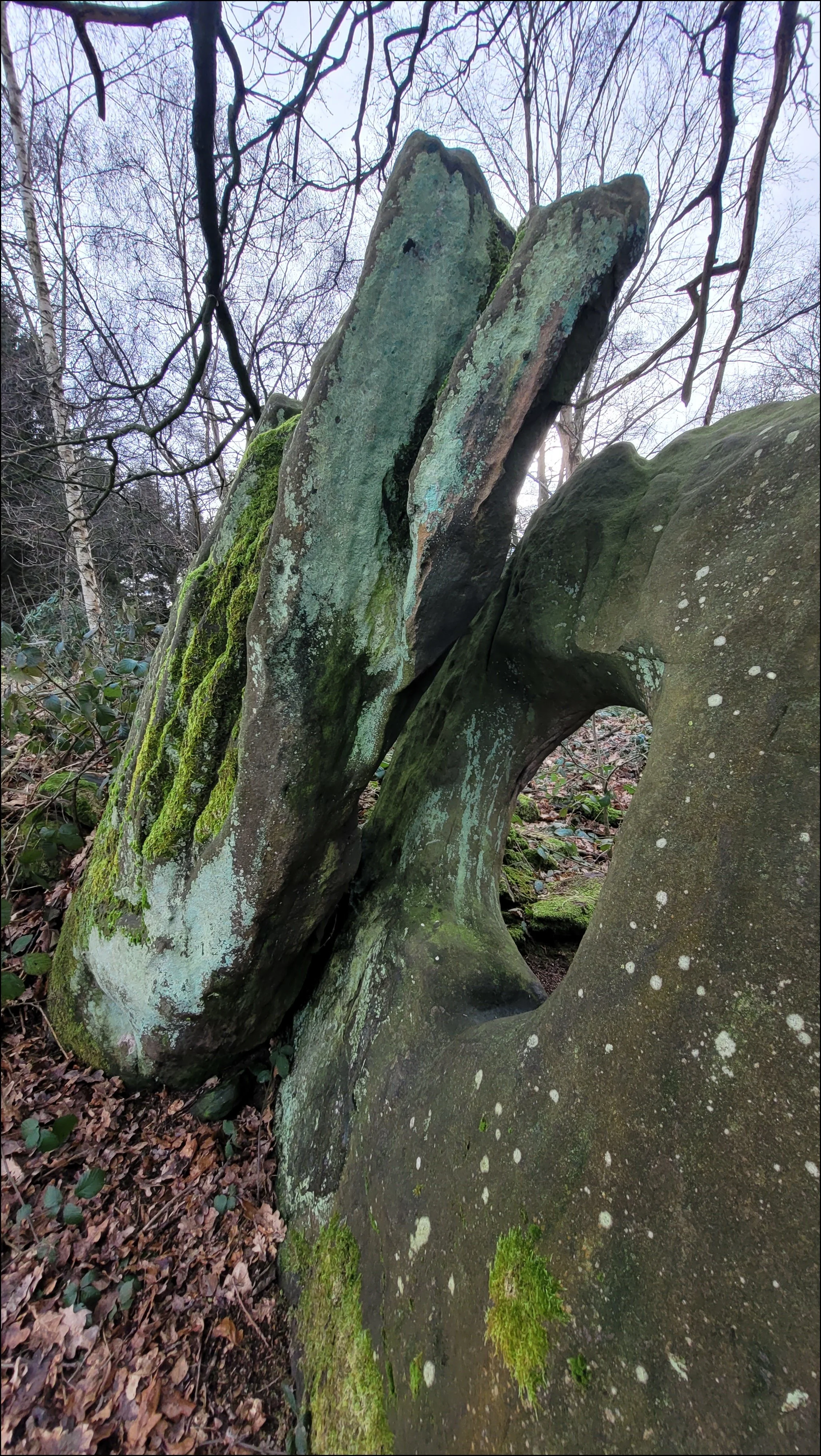 A large slab stood angled back with a twelve inch wide hole in it’s centre. Overlapping it slightly was a second larger stone with deep vertical gullies running down it resembling the fingers of a hand. I had seen nothing like it and was immediately struck by their sculptural nature. They could have been shaped by Anthony Caro or Joan Miro. Green moss covered much of their surface and the hole in the right hand stone looked extremely smooth. Bare branches hung down creepily from the tree which oozed a black sap high up through it’s bark.