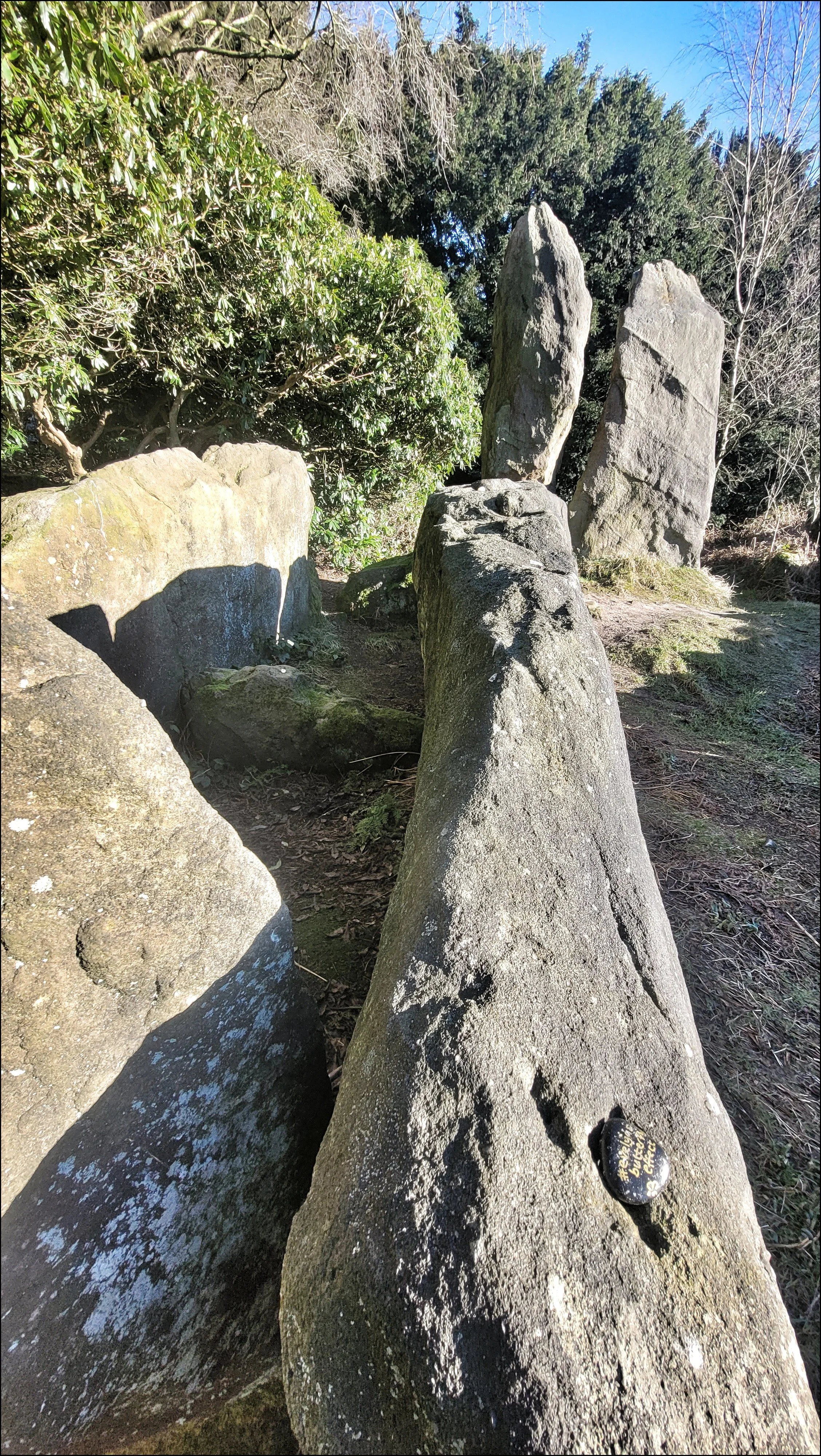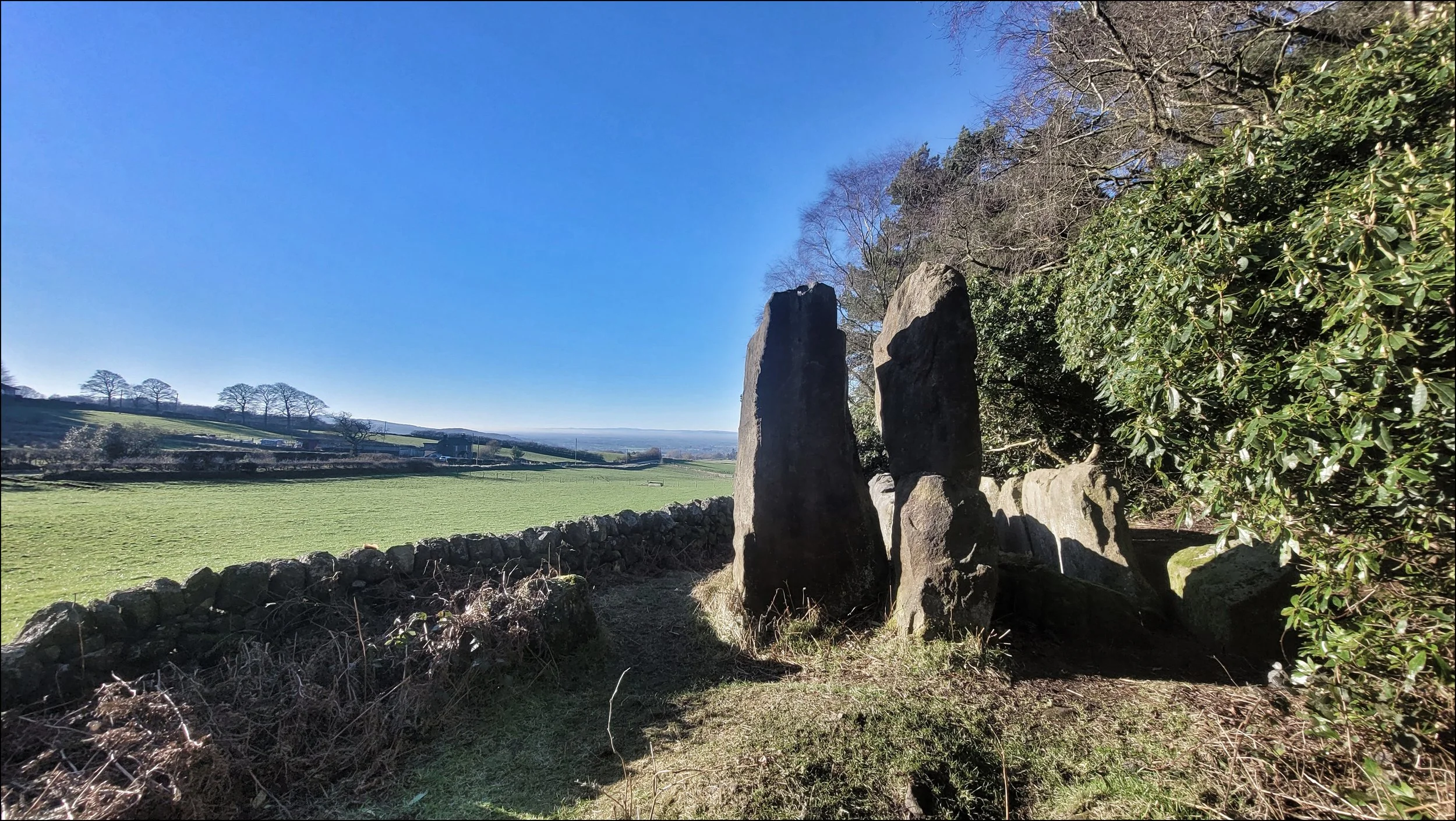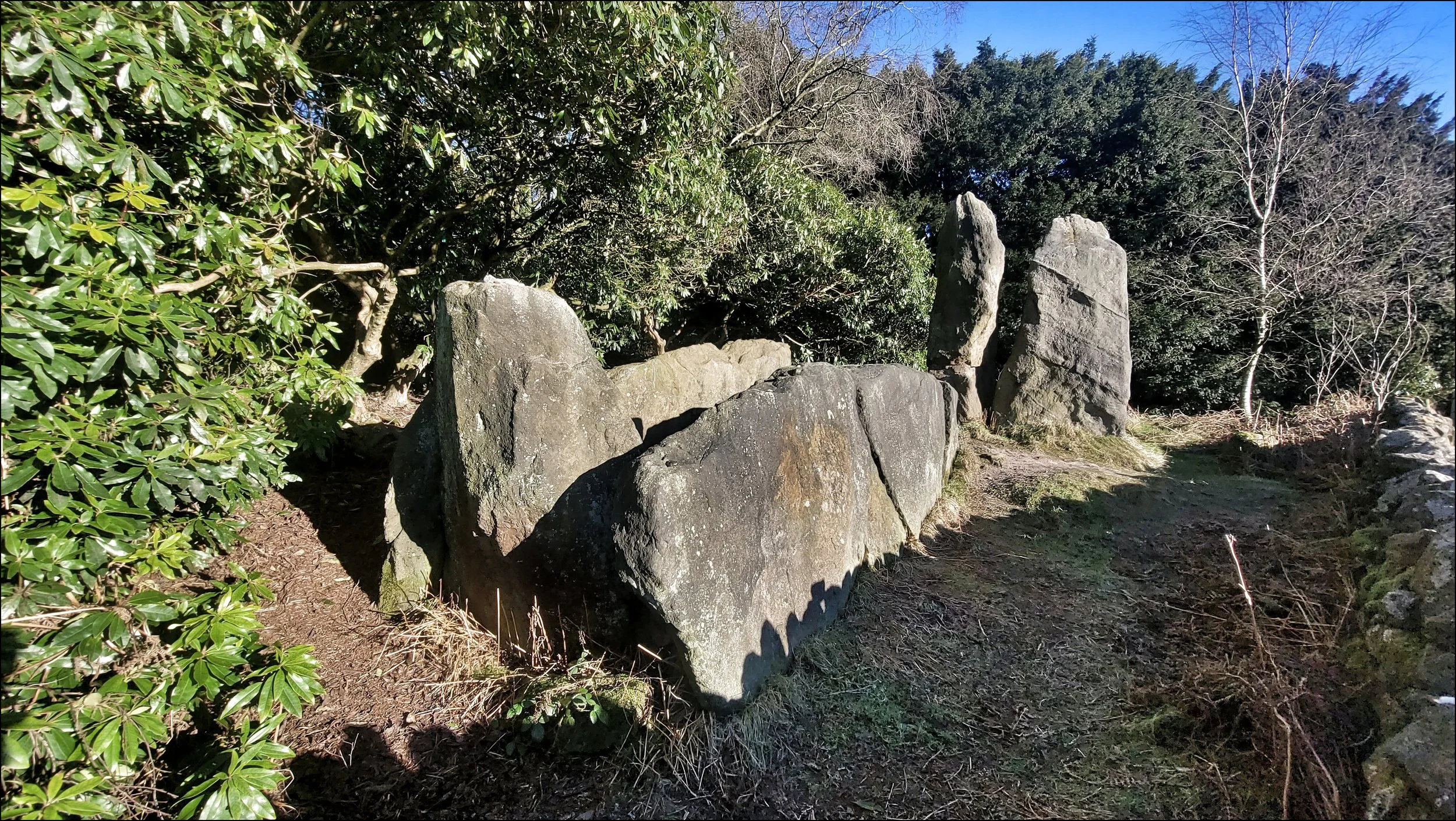 I had come to the Cheshire Plain to find a Neolithic burial chamber more associated with south west Scotland than central England. The Bridestones, not to be confused with those on the North York Moors , is a Clyde style cairn with similarities to Cairn Holy and Boreland in it’s construction. A short drive from Timbersbrook south for a mile brought me to the driveway of a stonemason’s yard off Dial Lane. I parked by the entrance and with no one around to seek permission I walked a short distance through some trees to a clearing that was just big enough to contain the colossal stones that made up the burial chamber. It was a claustrophobic space surrounded by rhododendron trees and sadly a neglected setting for what is a unique historical structure.