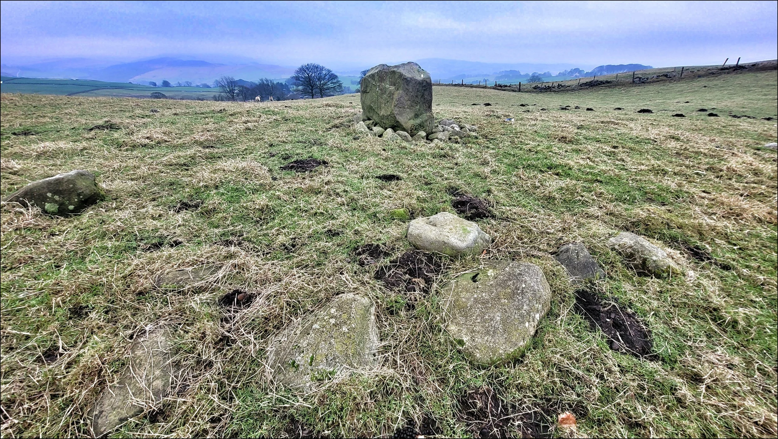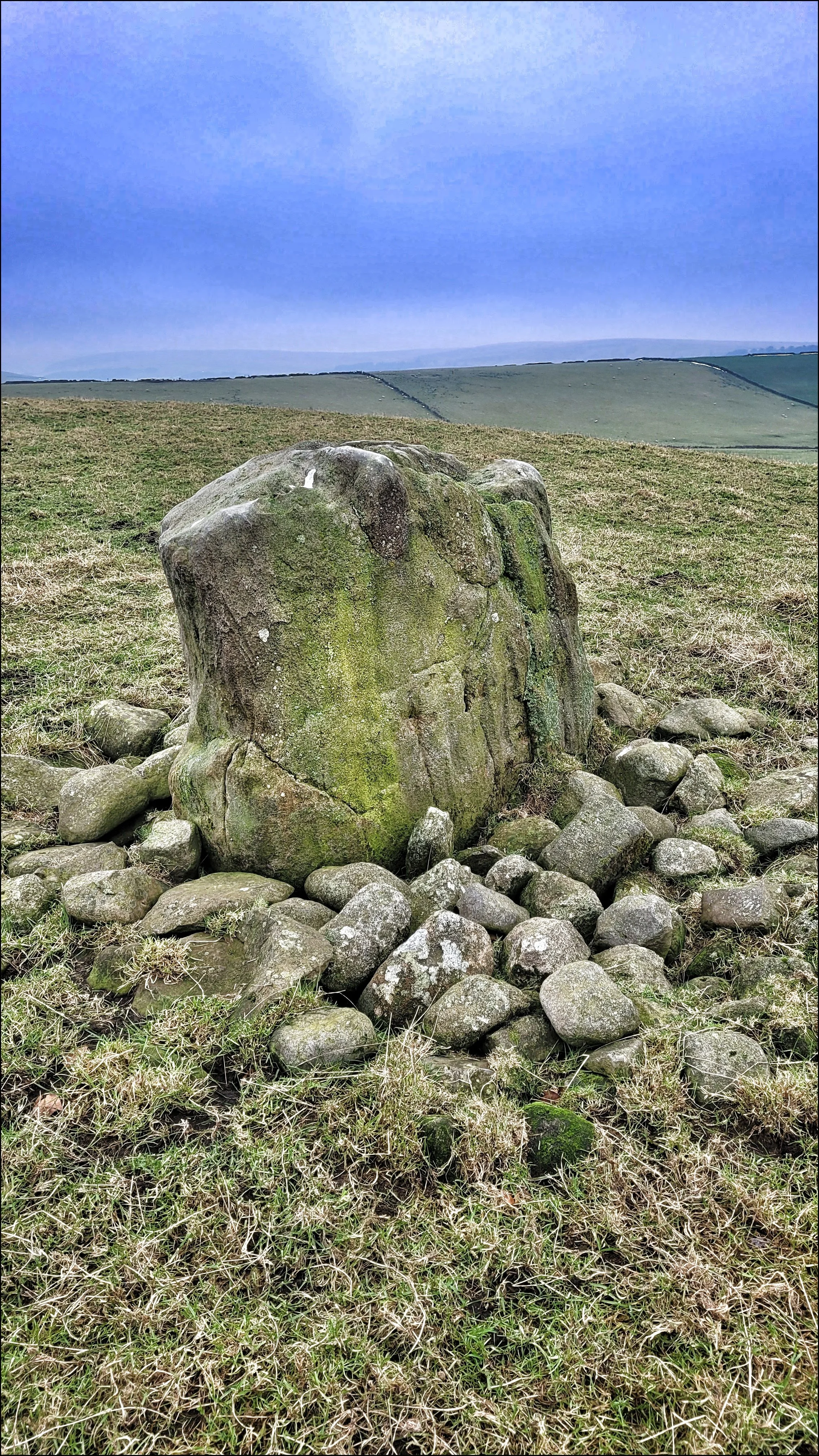 I continued on east towards Winkle south of Macclesfield at the western edge of the Peaks. A narrow straight lane took me up over Brown Hill where I pulled over knowing the Bullstones Stone Circle was nearby. I scouted the landscape around and soon spotted a large stone in a field to my right with the faint trace of smaller stones around it. I hopped over the gate and headed over to the stone scattering the sheep as I got close. The central stone was about a metre and a half square and looked like it was sat on a shallow mound with a collection of loose rocks at it’s base that looked like an added feature. The circle around it was eight metres in diameter with regular sized stones half buried and closely packed together. Remains of a juvenile along with an arrowhead and a knife had been unearthed here in the late nineteenth century, confirming this to be the site of a cairn circle. There were a few outlying stones but it was hard to make sense of their layout. Far beyond them in the distance were the odd slithers of snow on the gentle rolling hills of the Peaks. As the Bridestones had done, The Bullstones reminded me of another Scottish Neolithic type, the larger circle of Glenquicken, also in Dumfries and Galloway.