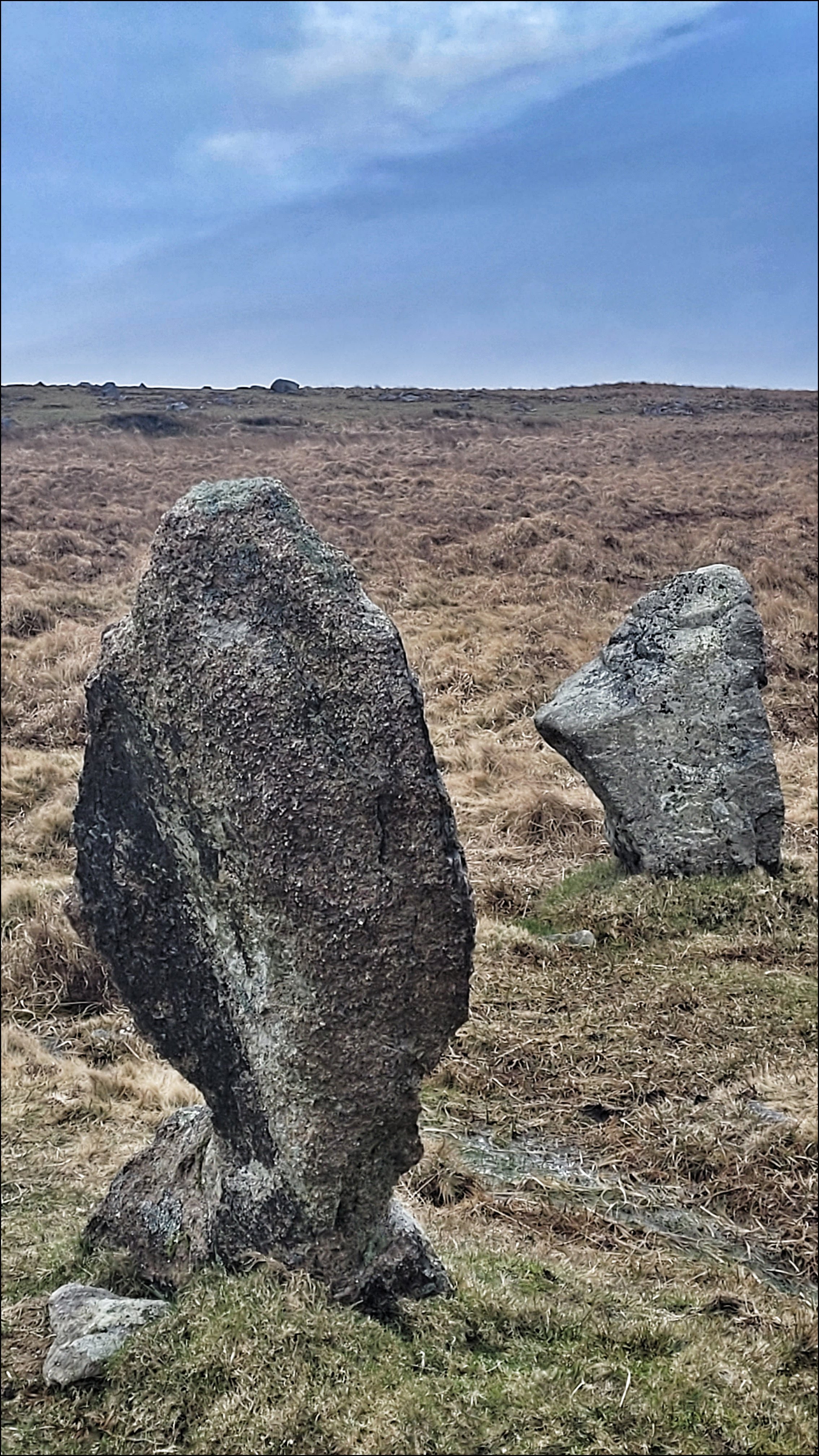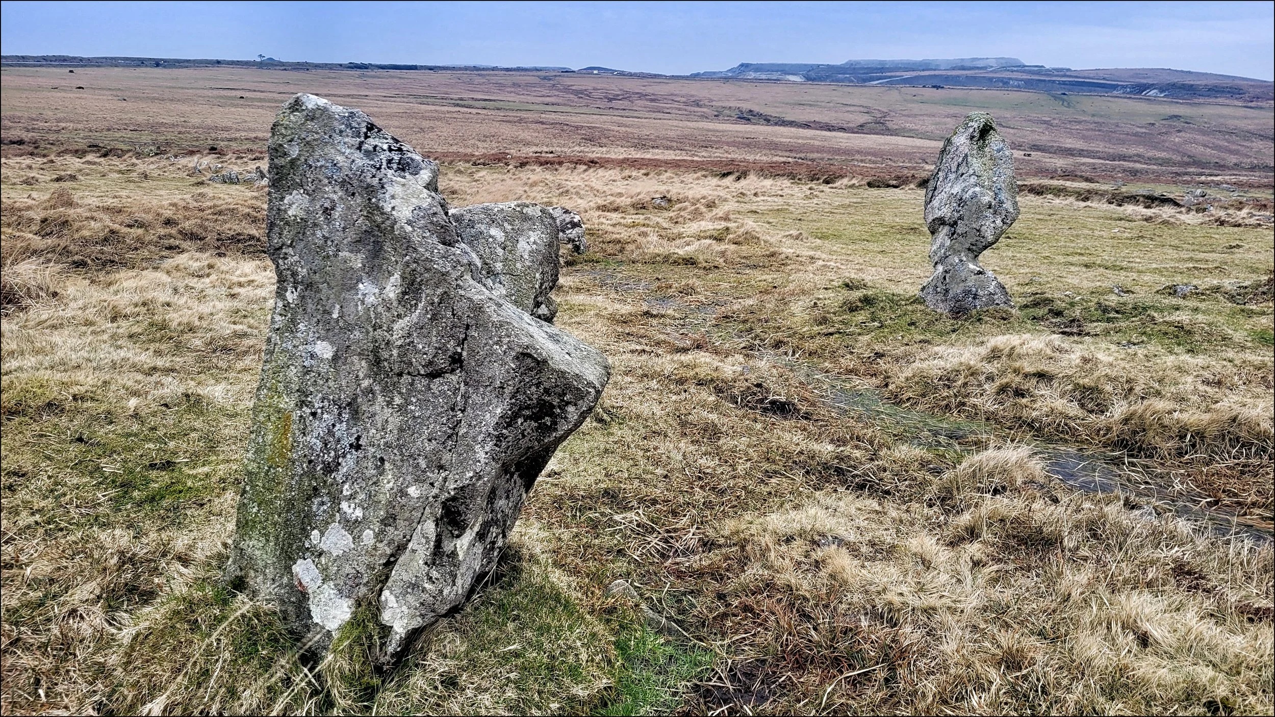 The first structure I came upon was the Cairn Circle known as the Pulpit. It had a diameter of just six and a half metres and was pretty much intact with all it’s stones still upright. The centre of the circle was undulating and very waterlogged. The tallest stone had a narrow base and bulbous top which looked heavy enough to snap off at any moment. It leant at an acute angle and marked the point where the start of the East Row began. It was a double row of knee high stones that descended down the hill and was dissected in two places by leats, one dry and one in full flow with high banks. The banks were too high to jump across so I followed it north to an easier crossing point to find the West Row which ran perpendicular to the East Row and had a small Cairn Circle of it’s own. Again the row began at a conspicuously larger stone and ran for eighty metres down the slope in a westerly direction. At the far end I could see a triangular terminal stone. It was a fascinating layout where the rows were configured against the norm of a parallel pattern, made all the more complicated by the addition of the Leats.