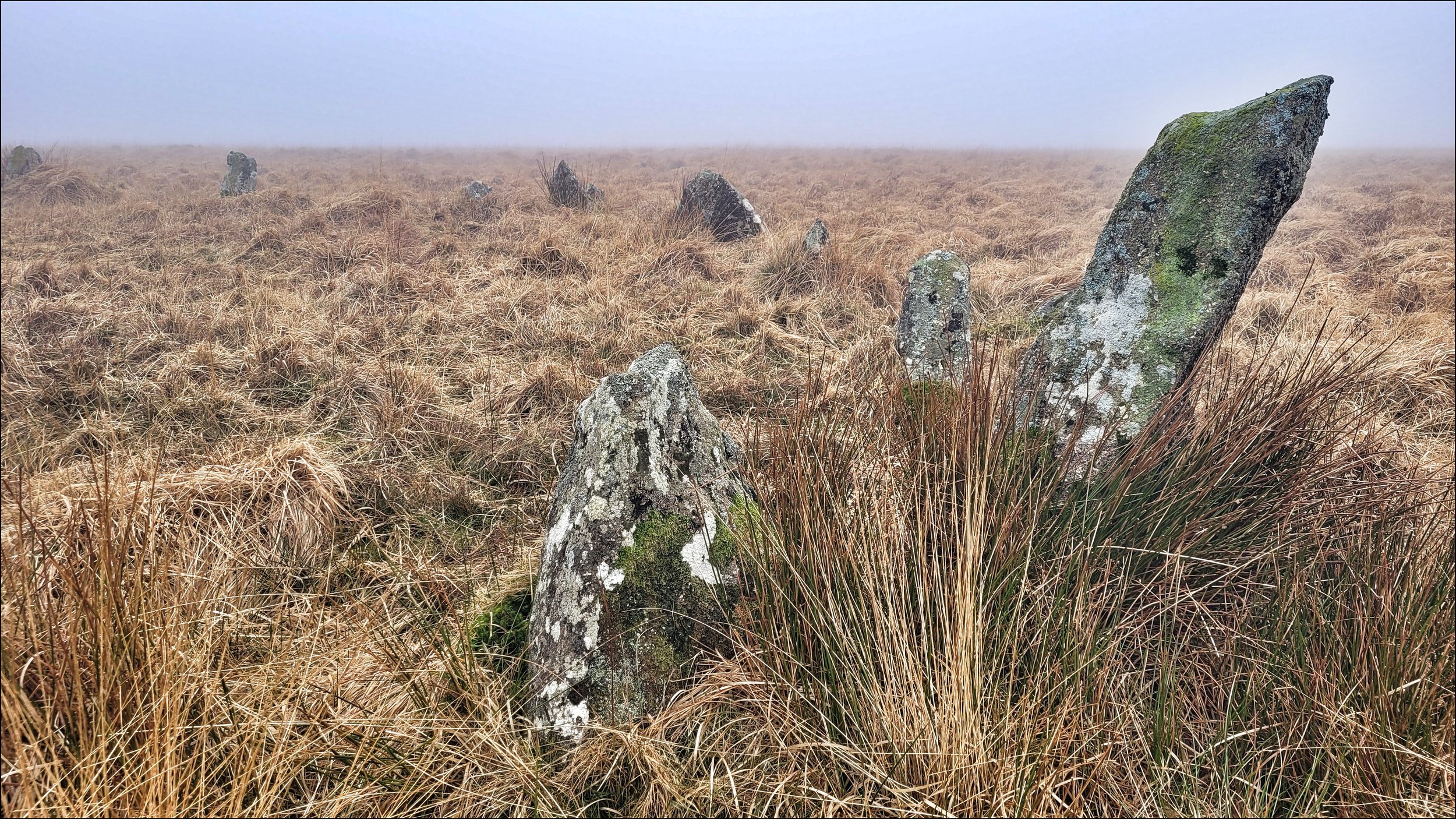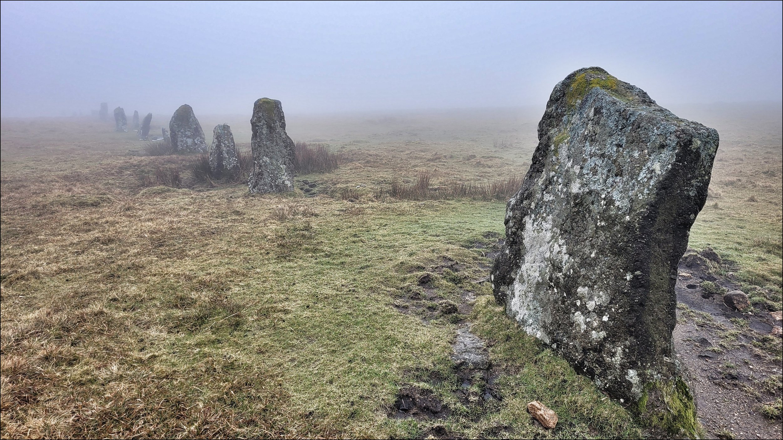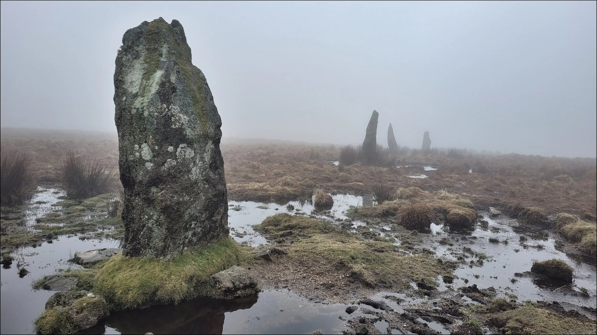 From the village centre I took a narrow lane fringed with quaint cottages to an old stone bridge over the River Yealm and then up through woodland, a farm track brought me to a gate where a service road lead me to and around a water depot. The ground began to get muddy up to a stone wall where I squeezed through another gate at the foot of Stalldon Barrow Hill. As I climbed the mist descended and my only reliable guidance was from Ordnance Survey which showed the Stone Row of Stalldon off to the left. A dark shape appeared through the mist which turned out to be a large terminal stone that marked the bottom of the row. It was five feet in height and beyond it I could only see four stones as the row disappeared up the hill into the mist. As I followed their line they got bigger, until at the top of the hill their height reached over seven feet. There were four of these giants, known as the ‘Cornwood Maidens’. They looked mysterious in the mist and appeared at odds with each other, leaning at opposing angles and each standing in a waterlogged ditch. This was largest and most dynamic row I had seen yet and I hoped the mist would lift for an instant to view it in it’s full glory.