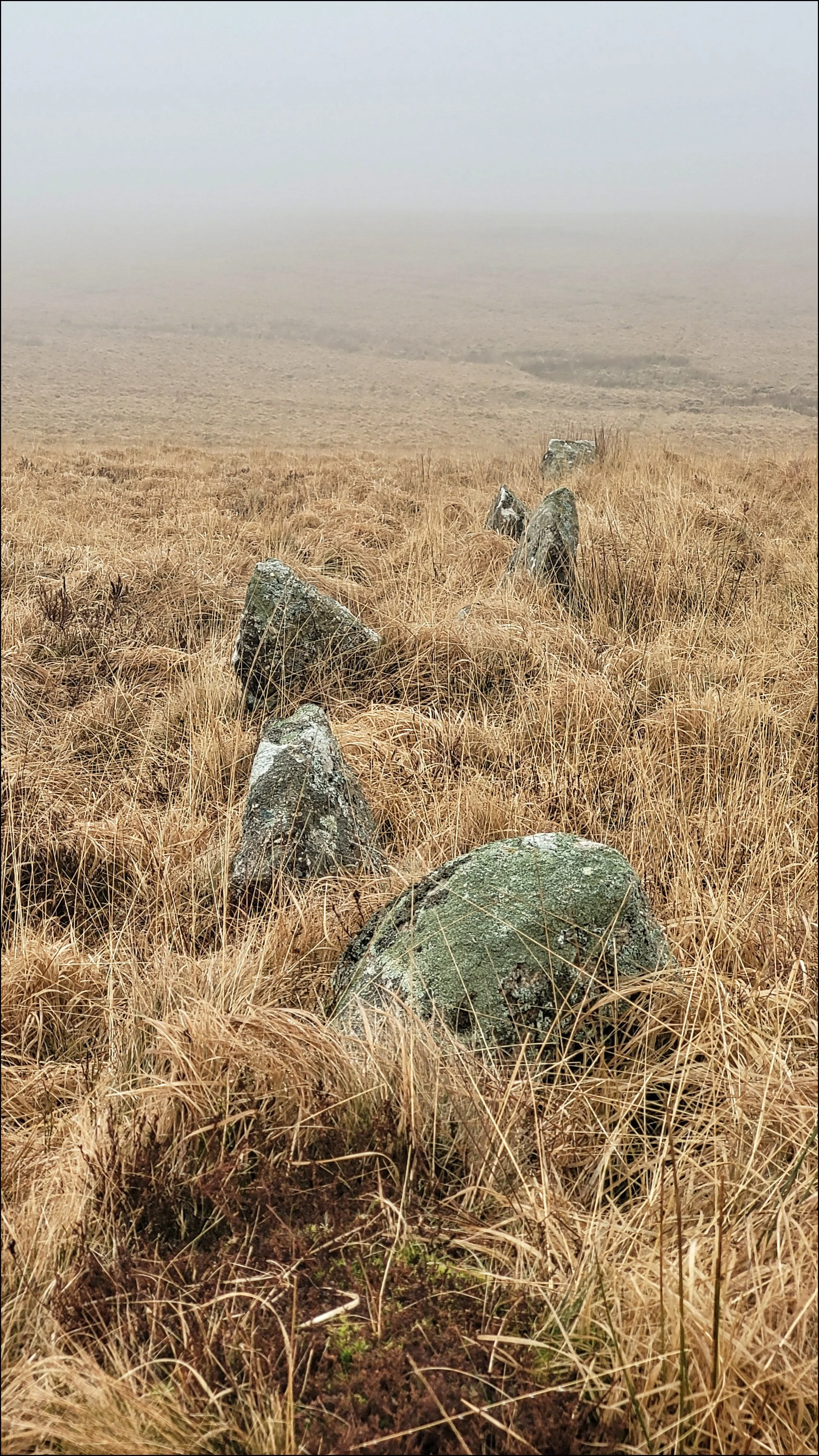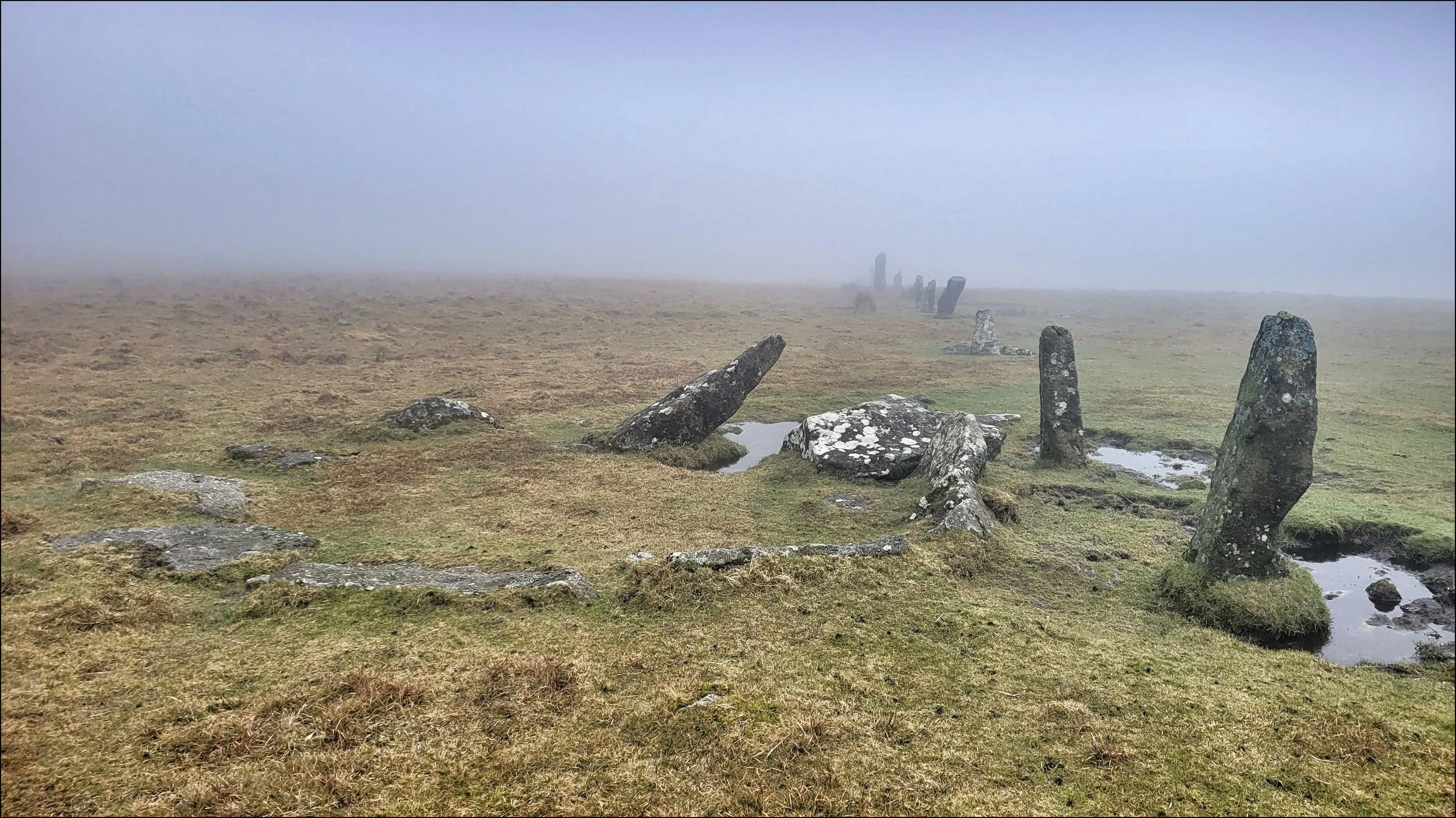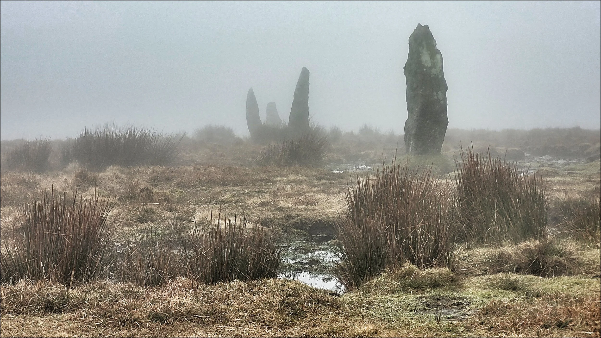From the village centre I took a narrow lane fringed with quaint cottages to an old stone bridge over the River Yealm and then up through woodland, a farm track brought me to a gate where a service road lead me to and around a water depot. The ground began to get muddy up to a stone wall where I squeezed through another gate at the foot of Stalldon Barrow Hill. As I climbed the mist descended and my only reliable guidance was from Ordnance Survey which showed the Stone Row of Stalldon off to the left. A dark shape appeared through the mist which turned out to be a large terminal stone that marked the bottom of the row. It was five feet in height and beyond it I could only see four stones as the row disappeared up the hill into the mist. As I followed their line they got bigger, until at the top of the hill their height reached over seven feet. There were four of these giants, known as the ‘Cornwood Maidens’. They looked mysterious in the mist and appeared at odds with each other, leaning at opposing angles and each standing in a waterlogged ditch. This was largest and most dynamic row I had seen yet and I hoped the mist would lift for an instant to view it in it’s full glory.