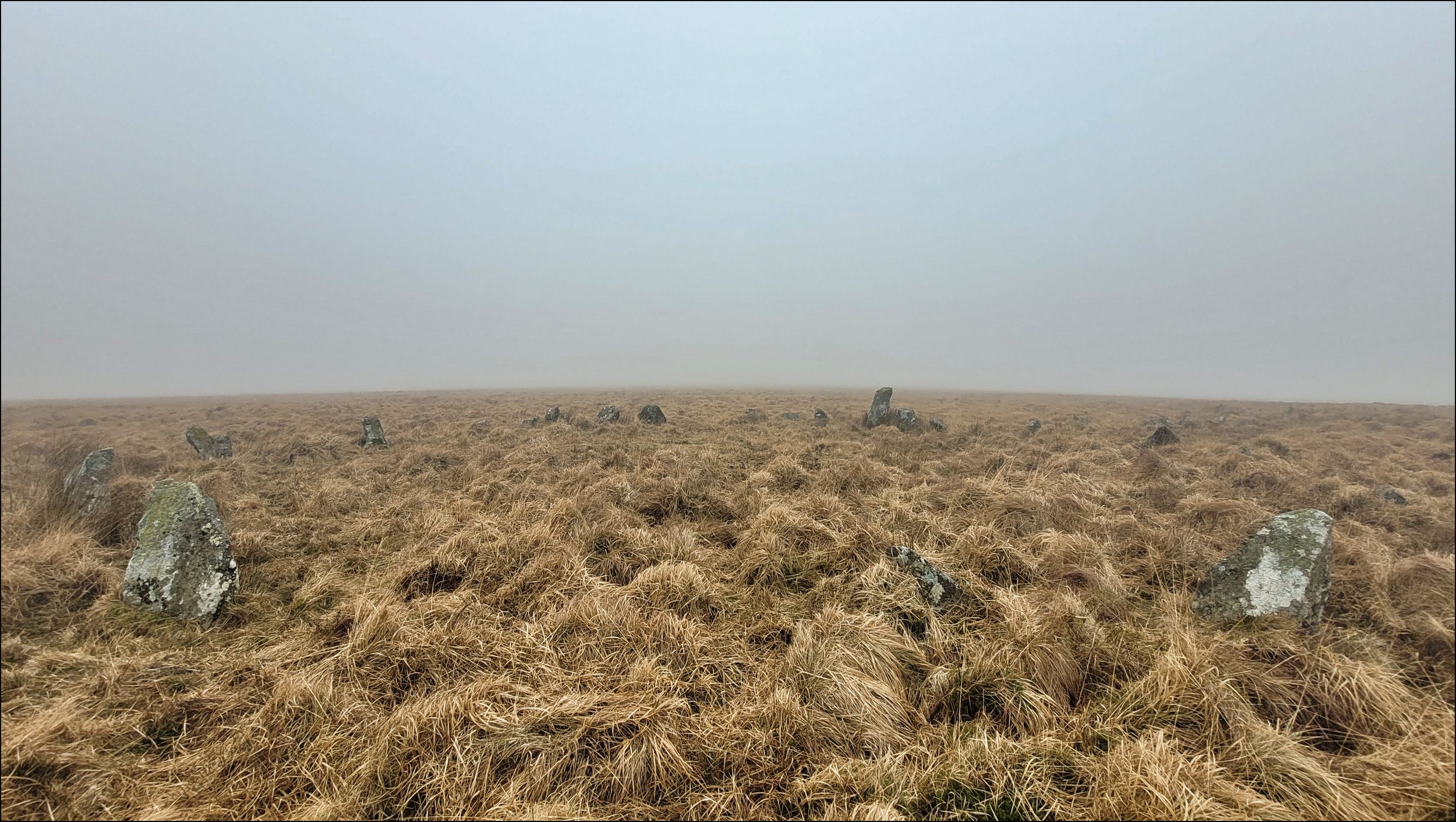 I carried on down the northern slope with OS as my guide. Ahead about an hour away was the Upper Erme Row, the longest stone row in Britain at a length of over three Kilometers . As long as I kept the River Erme to my right I would stay on course. I dropped down to the bottom of the valley and crossed Bledge Brook, a tributary of the Erme. The mist had cleared a little and I could see the crest I was aiming for for the first time. The ground became harder and as I moved away from the river the going got easier. Then suddenly I was upon the stone circle of Kiss-in-the-Ring, a fifty foot wide low lying circle with all twenty six stones present but unevenly placed. I had come to Dartmoor at this time of year because of the die back of the ground cover enabling a better view of sites with low lying stones. On the far side of the circle was the starting stone for the Upper Erme Stone Row. I started walking along the closely laid stones that poked up through the dormant straw grass. They were no more than a foot high and disappeared off as far as I could see. I was two and a half hours into my walk and I would soon have to start heading back if I was to arrive before dark. I pressed on for half a mile before the row began to rise up to Green Hill to the north. Supposedly there are over a thousand stones in the row and taking into account all the gaps, there would have been twice as many at one time. It was a potent structure to be close to and I couldn’t help to imagine the human traffic along it over the last five thousand years. I turned around as the mist came down once more. This was not the day to walk it, but on a better day I will walk it’s length.