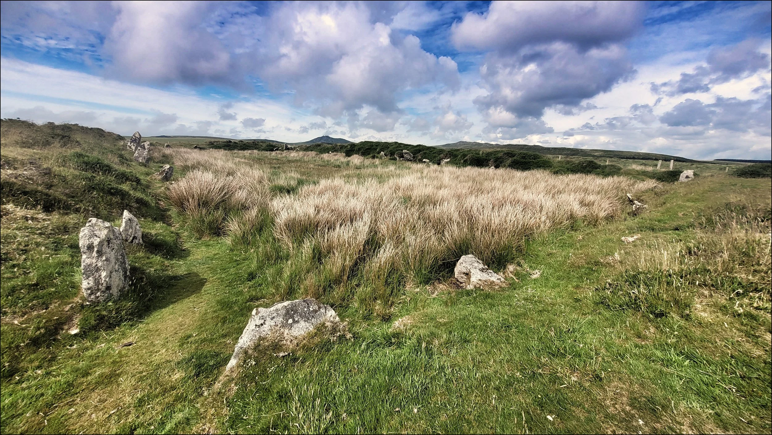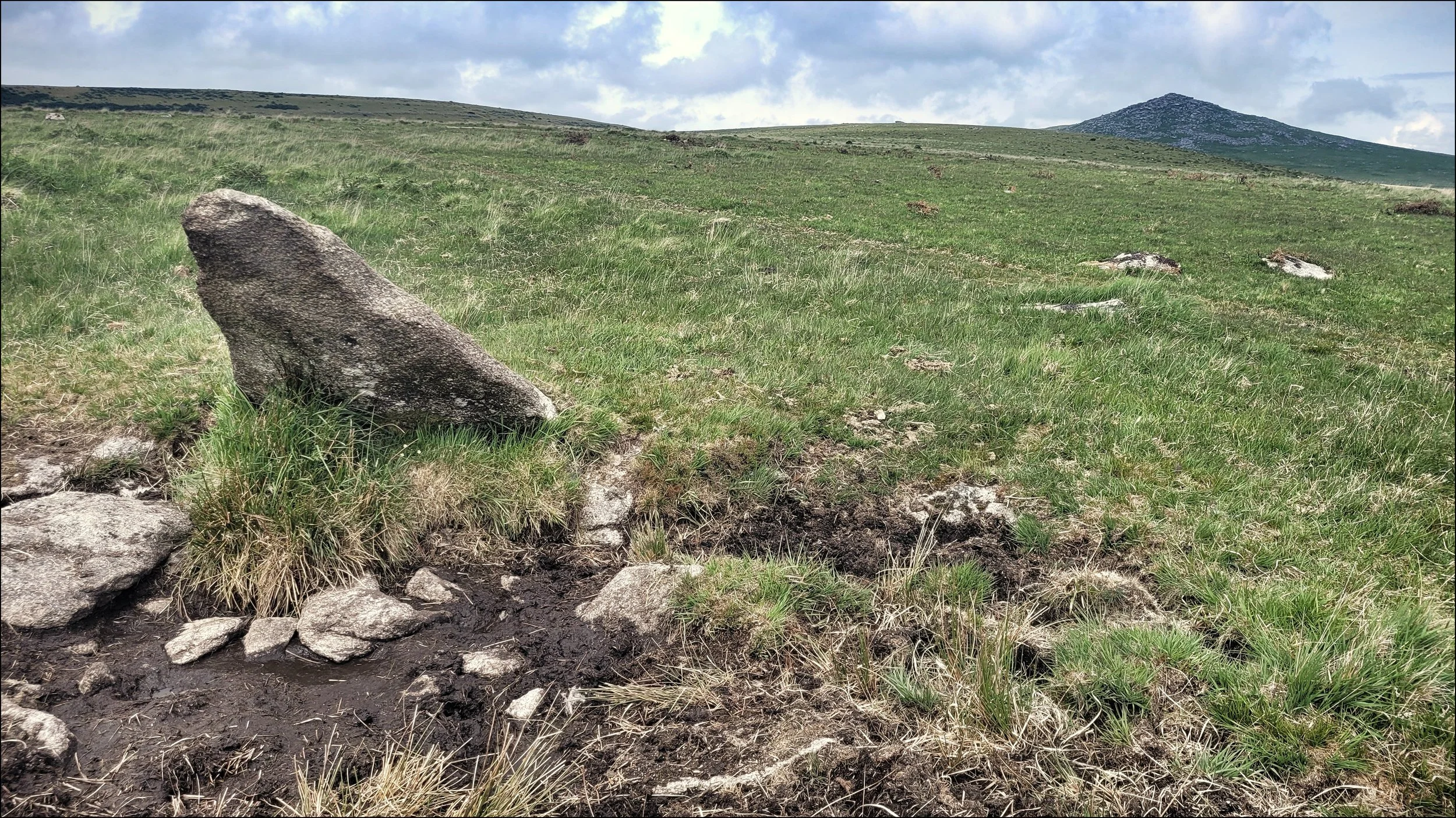 North East of Brown Willy, the highest peak in the south west are a collection of ancient sites that are possible to see on a circular walk from Jamaica Inn. I headed under the A30 as I’d done the day before and found a path through pastures up to Tolborough Tor and over the other side to Catshole Down. I came across a barrow here in a pretty ruinous state with only one small upright. It wasn’t marked on OS but was listed as Catshole Downs Long Cairn on Megalithic Portal. I could see a track up ahead that would take me around the north eastern side of Brown Willy for a good hour and on to Rough Tor, my first destination.