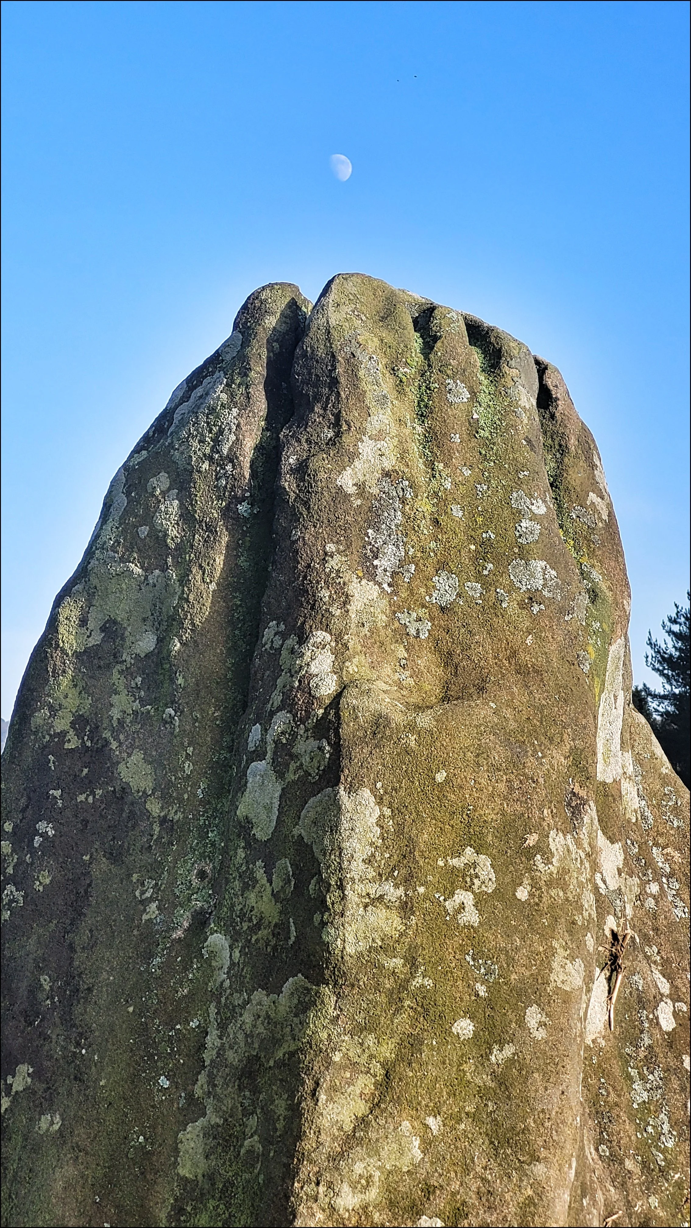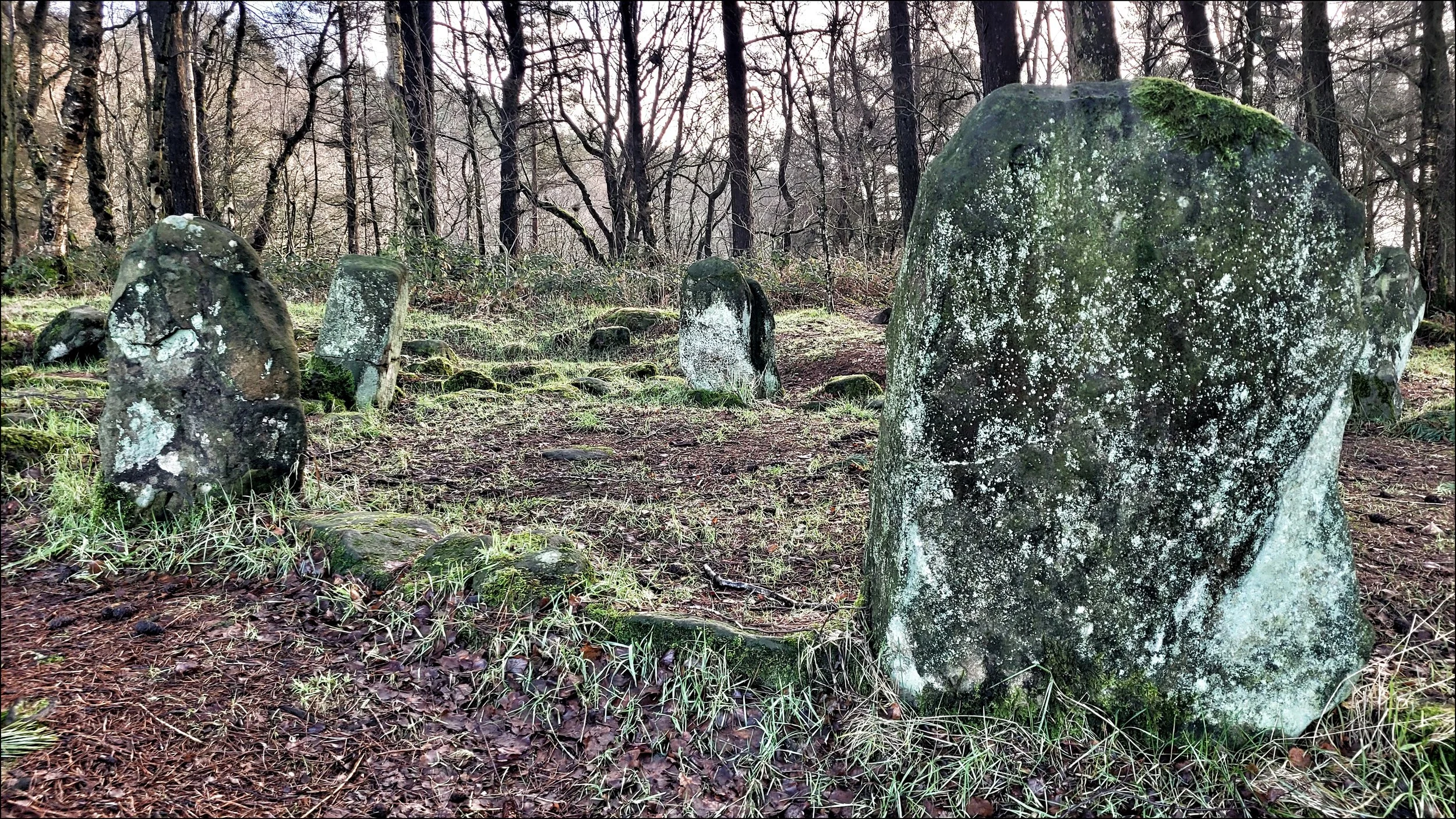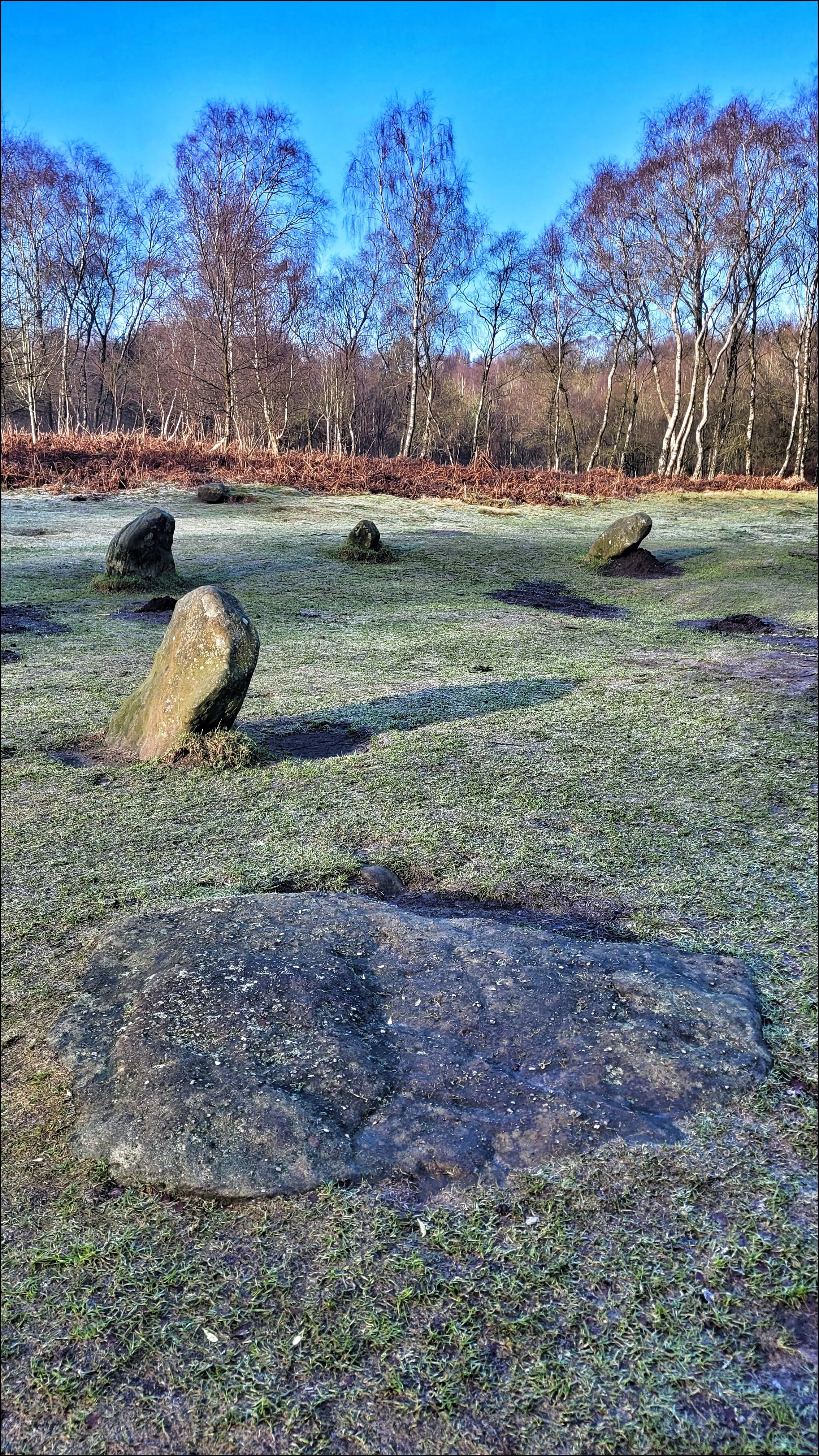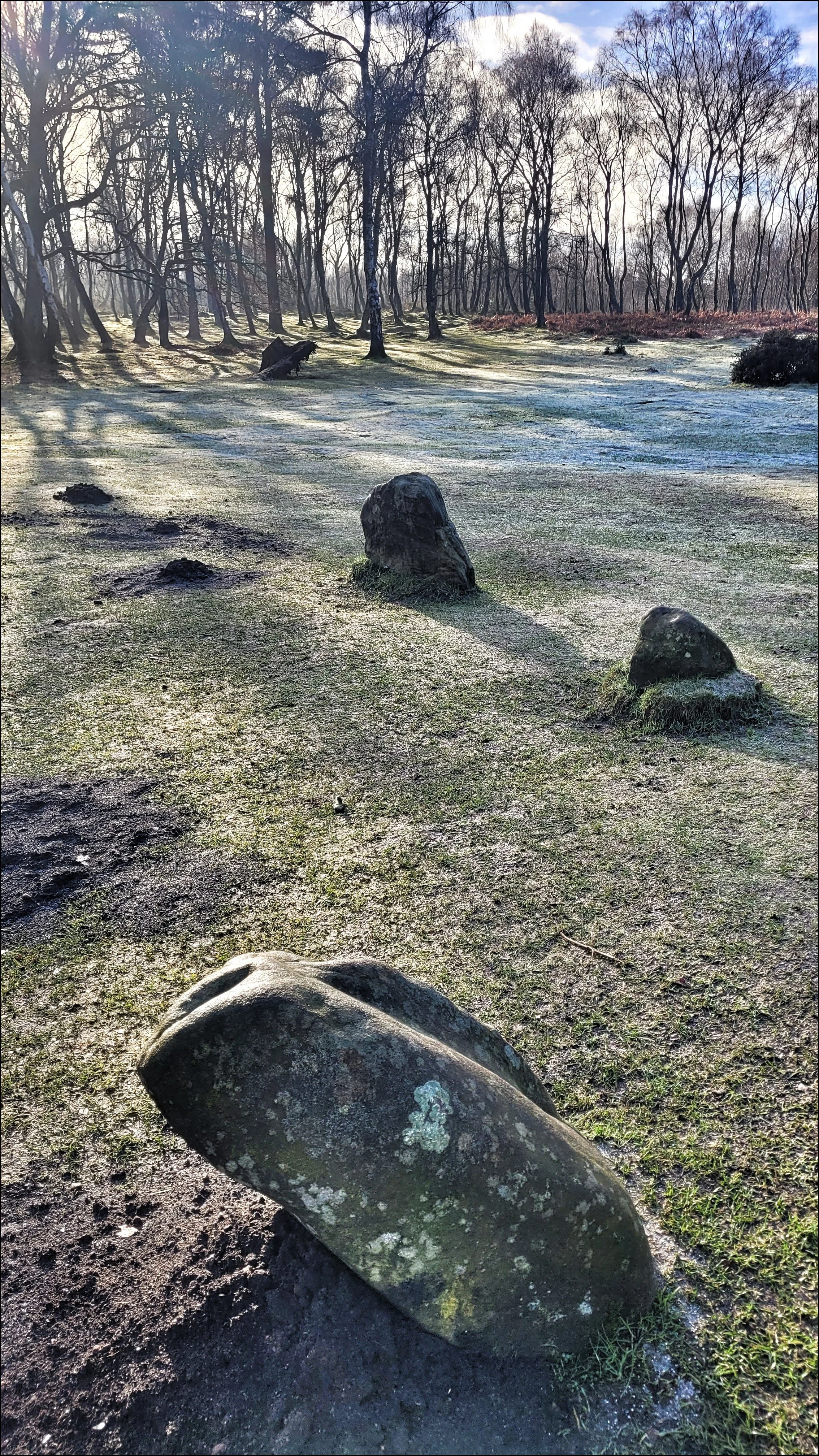Half a mile on, the dormant fern cover gave way to a clearing of frosted grass and long shadows from surrounding birch trees. There in the centre was a circle of nine low lying stones. I had been here before in the summer of 2023 but had experienced a flat reaction. This time as I approached I immediately felt an inexplicable stirring of some kind. This feeling happens occasionally and is usually sharpened by the privilege of having a solitary encounter. This was a popular circle with walkers and with those who have a megalithic interest, so I was again lucky to have the circle to myself. I set about what I’d come to do, taking detailed close up shots of the textures of the stones. But with the improved ambience from my last visit I spent more time photographing it more thoroughly.