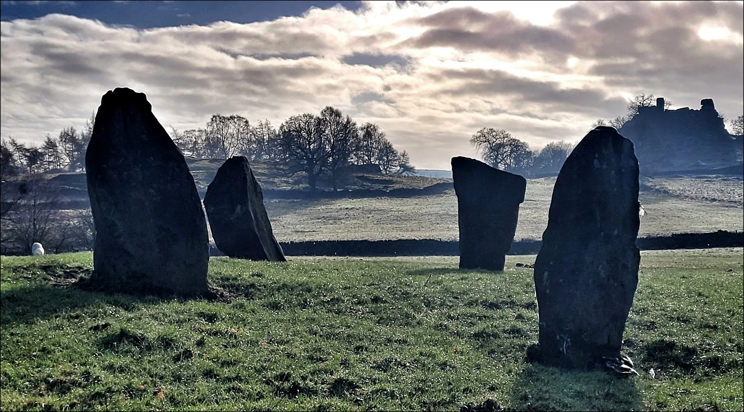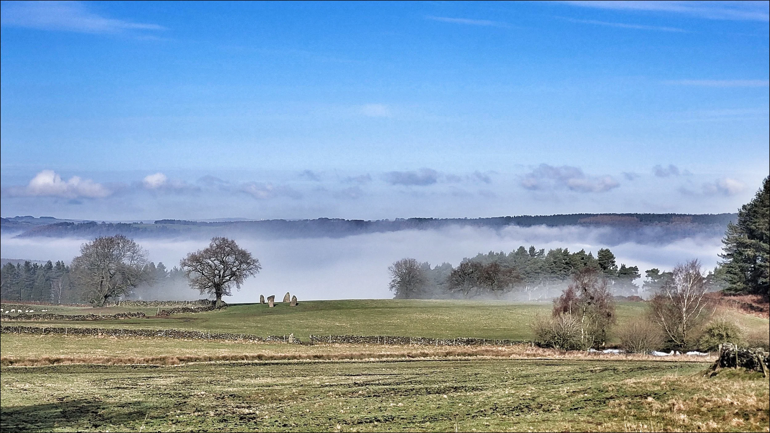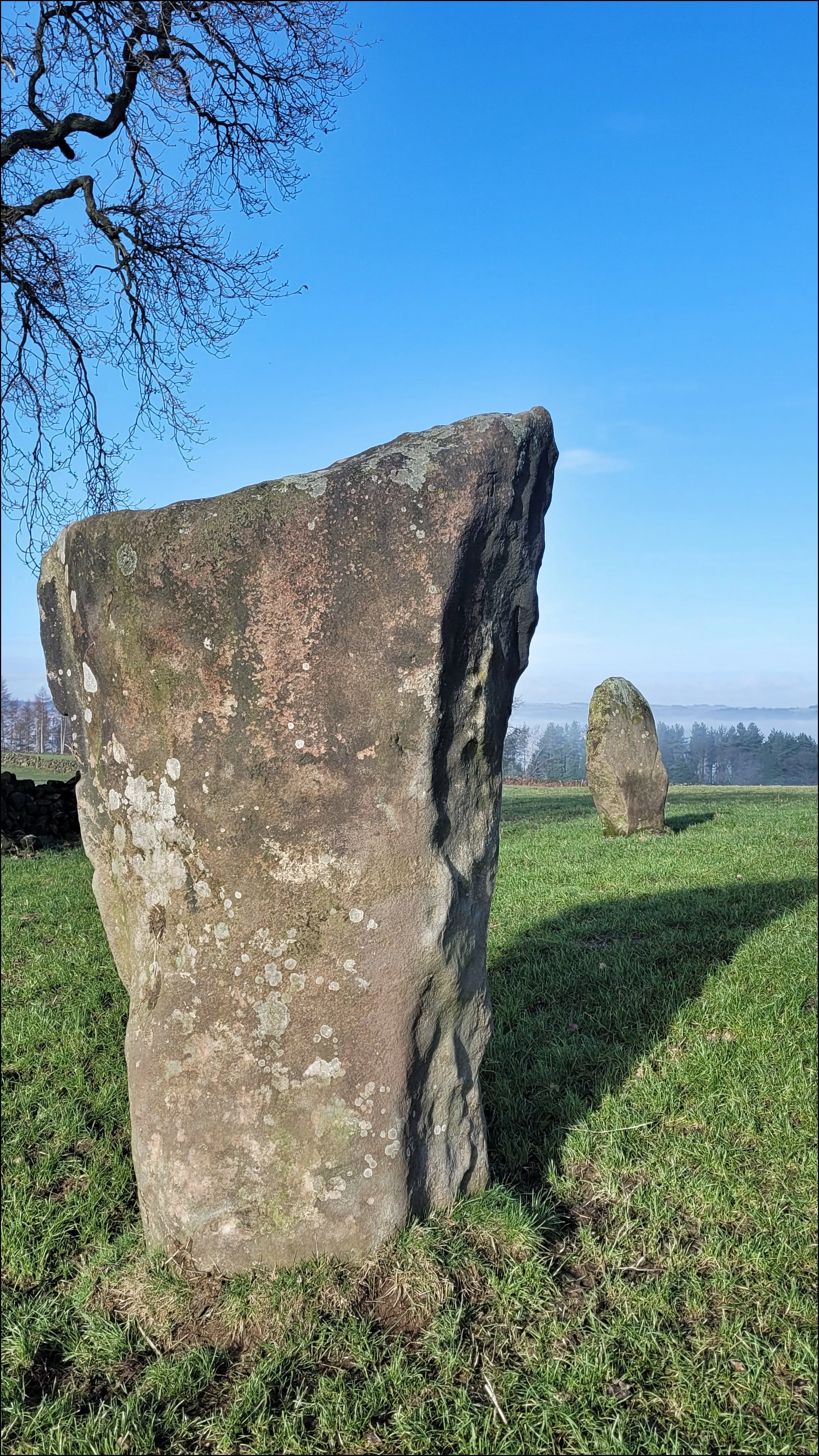 As I got close the valley beyond came into view, still blanketed in low cloud. I adjusted my approach so each of the stones stayed separate from the other and then greeted each of them in turn. This was a circle that changes it’s character and appearance dramatically every few steps you take around it. Up close the tops of the tallest two were scarred and stained by millennia of rain. At one time there may have been twice as many stones present and it’s construction, as suggested by Aubrey Burl, was for astronomical reasons. He observed that from the circle the moon descends over Robin Hood’s Stride during the Major Lunar Standstill. Standing by the wall under the Oak tree, it was easy to imagine an ancient pathway passing through or by this circle. I had a strong sense that it was an emotional place for an ancient traveler to arrive at and that it was embedded in a network connected to places nearby. I glanced over my shoulder a few times as I walked away. I remembered the myth of the stones coming to life and dancing at twelve noon and midnight. I looked at my watch. It was mid afternoon and I had missed the matinee.