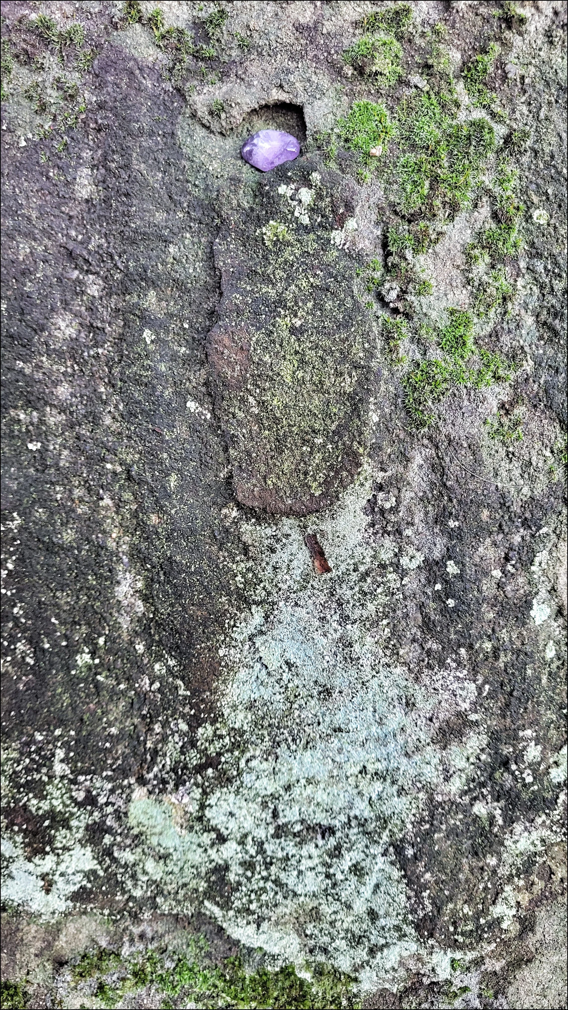 This is one of my favourite small circles at only six metres across and with none of the stones rising above a metre high. The setting is quite magical and a fitting place for a joyful ceremony with moss covering the ground, surrounding trees as well as the stones themselves. A cairn adjoins the circle to the north but it’s the circle that steals the show, looking as if it had been created by the hand of Tolkien. Respect had been paid here too with the placement of posies and painted pebbles. One stone on the eastern side had a tiny hole where a small Amethyst crystal had been inserted. An outlier stood nearby but this one had been clumsily erected more recently than my last visit with the crude placement of packing stones at it’s base. I sat with the stones for a while and began to listen in to them and to the quiet echoes of nature’s silence around me.