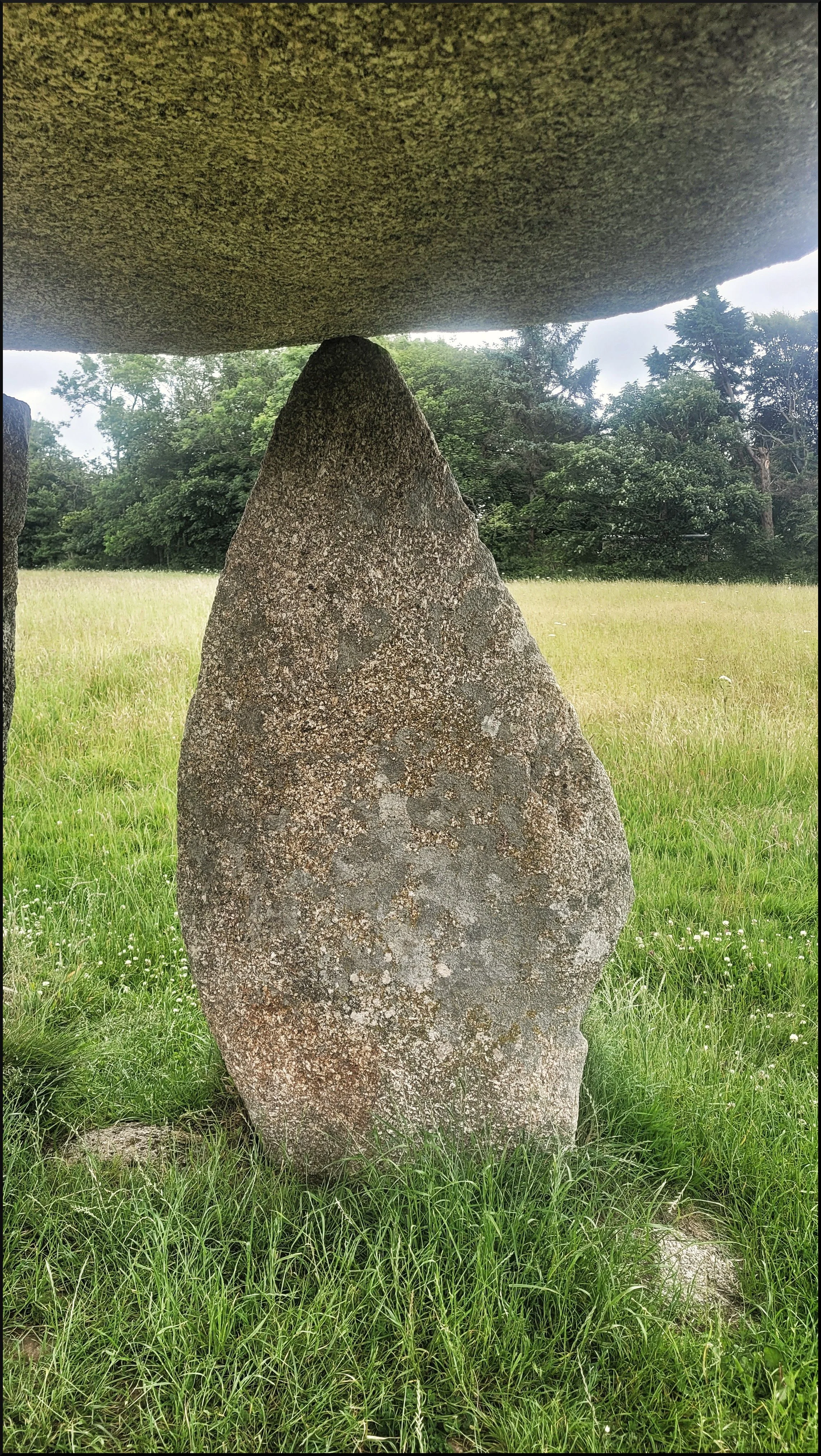 I stood underneath the thick capstone supported by three chunky uprights and noticed the absence of lichen, which I thought odd considering they had been lying in a heap on the ground for forty five years. I assumed they had been cleaned before their assembly. They now took on a strange mixture of pinky brown hues especially on the underside of the capstone. One of the uprights had a pointed top which gave the illusion of delicacy to the structure. I walked up to Pip Richards’ grave and sat on a bench placed there in her memory. The grave pointed down to the quoit. I felt a strong connecting force between them and it was touching to see Carwynnen restored to it’s former glory from this quiet corner.