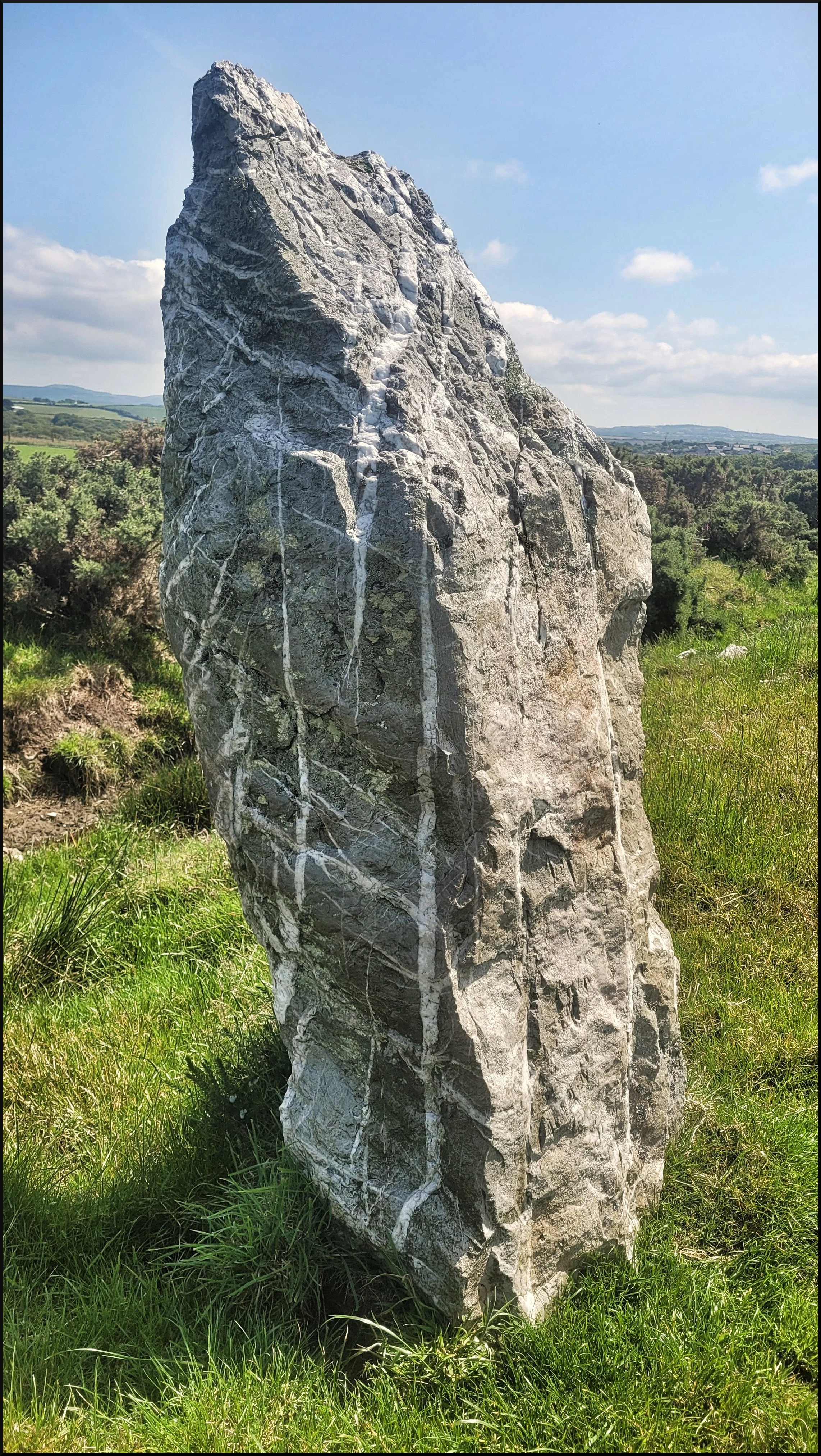 Further on up the A30 I branched off onto the A39 and pulled into a layby beyond St Columb Major. On the far side of a field to my right were a line of standing stones that looked quite big for a stone row. I walked a short distance down the road with no footpath to a gate which lead me into the waterlogged field. When I got close to the stones I realized how special these Nine Maidens were. Rather than granite stones these were slate with the most striking chaotic ‘Pollack’ like veins running through them. One of the row was a short stump and two of the row had fallen. The other six were very much standing proud and making a statement. ‘Look at us’ they seemed to be saying. There was no doubt these were some of the most beautiful stones I’d seen in the west of England.