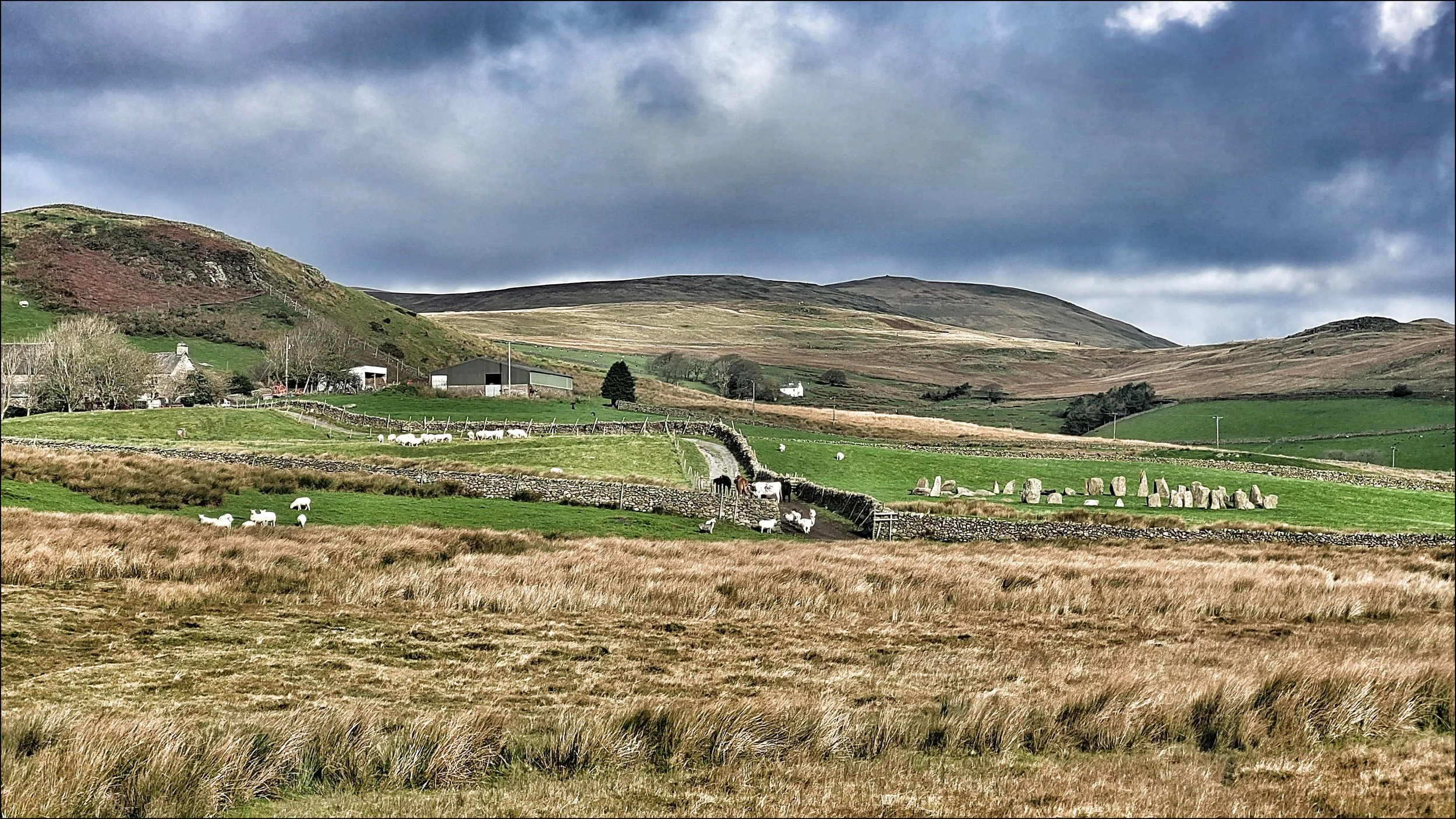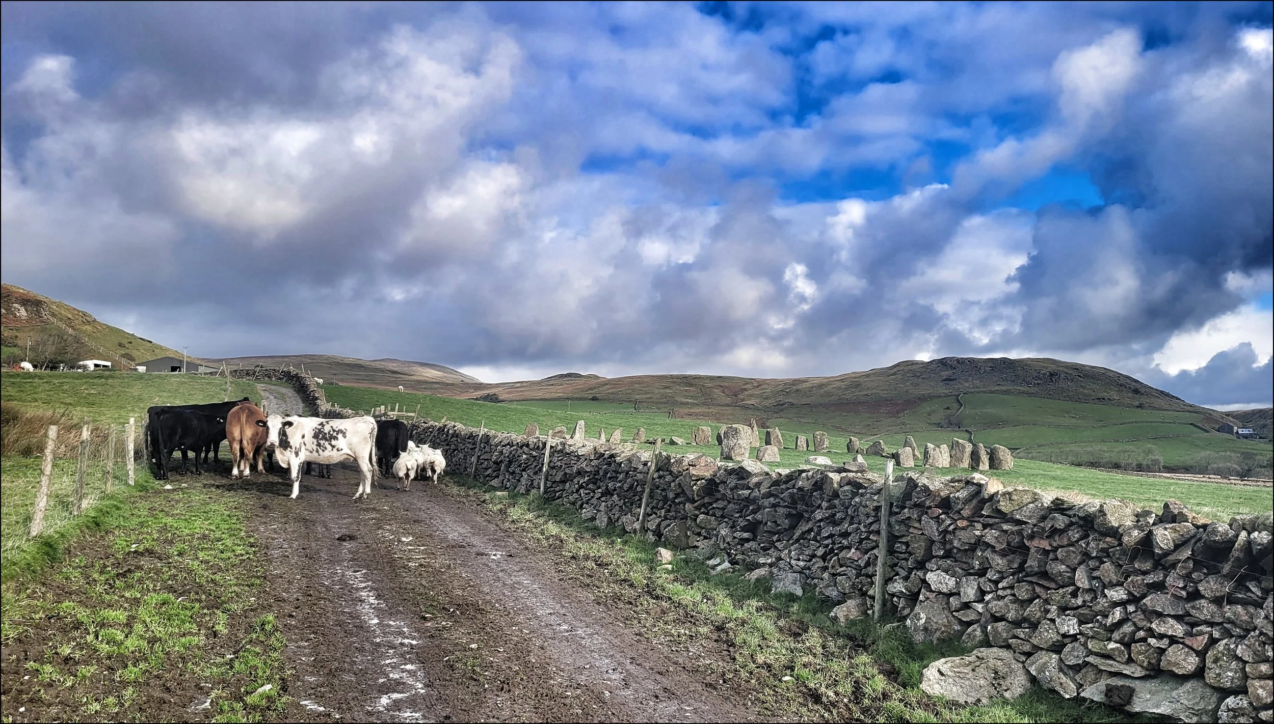 I set off early under a blue sky passing two heavy horses beside the path that led up the valley to the east of Whicham Beck. It was a gentle climb up through a wood where the path became rocky and I was forced to rock hop through water run off. At the edge of the wood past an ivy covered derelict farm shed I emerged out into a boggy field that bridged the woodland with moorland. Beyond the field ahead of me were enclosures of fern and gorse that rose up to Knott Hill. There were a few walls to negotiate on the way up. As I reached the ridge of the Hill I knew I would soon have a view down to the distant circle. I peered over the wall and there nestled in the glacial valley were the tiny specks of the stones of Swinside. There was a farmhouse near to it but nothing else aside from sheep and cattle that were being herded by the farmer on his quad bike. I started out down the hill but found a direct route impossible as the field was waterlogged. It took a while to pick my way through and then I found when I reached the farm track the herd of cows had blocked the gate to the circle. This was a test of my metal but luckily with a slow friendly approach the herd parted.