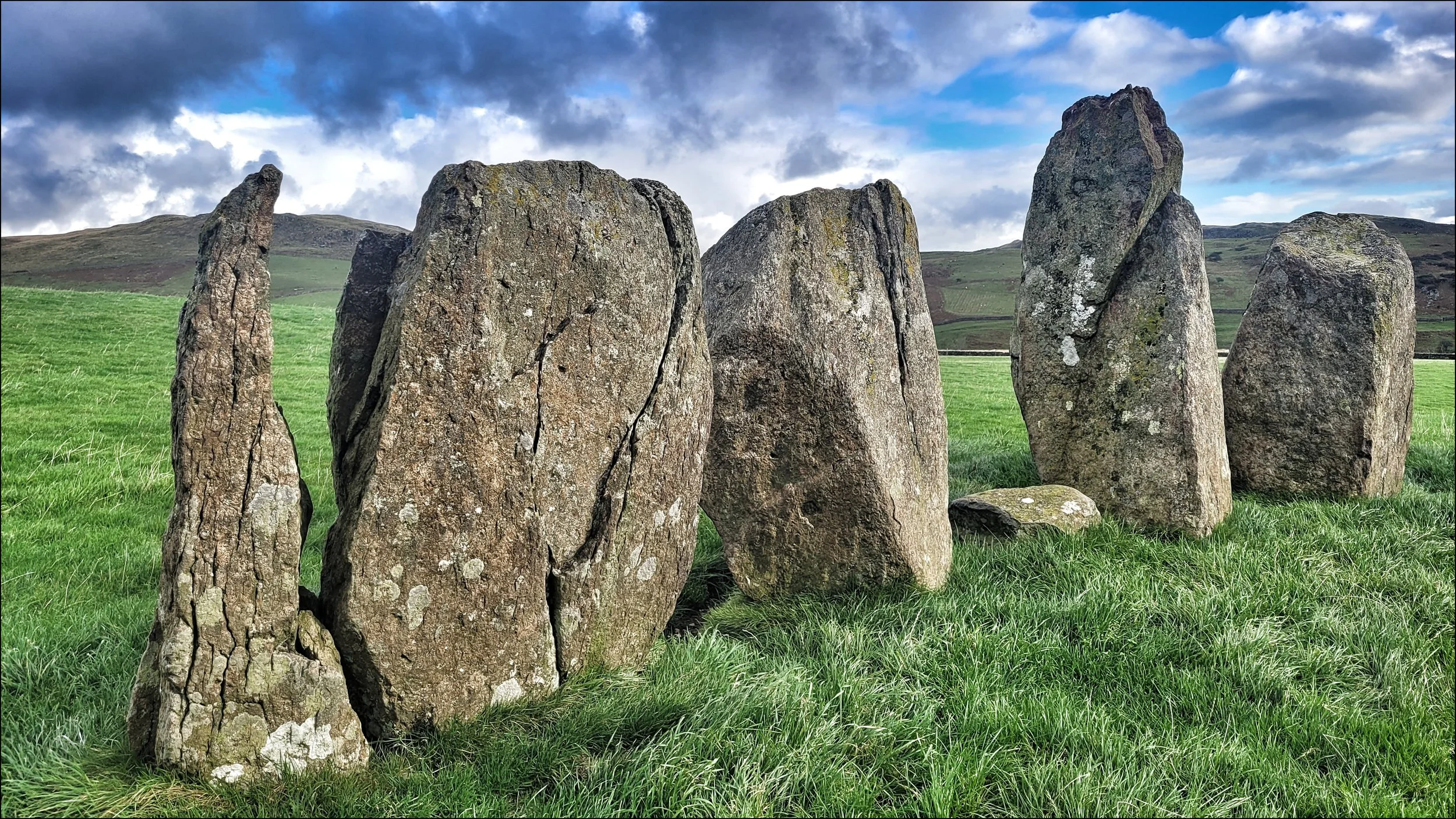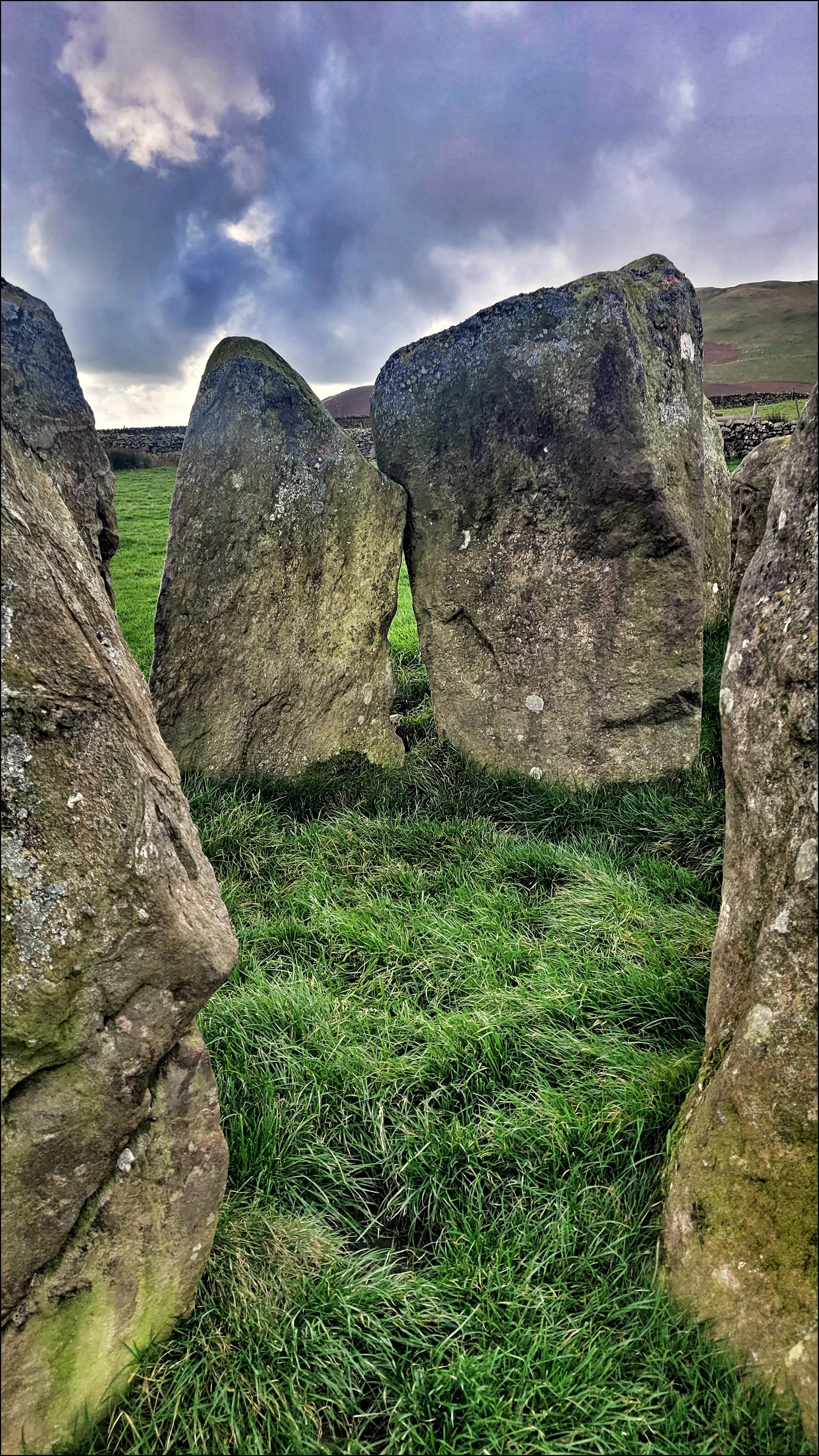 I passed through the gate and stood in awe, immediately registering the intrinsic beauty of this six thousand year old piece of architecture. I found it hard to take my eyes off it as I read the information board that defined Swinside as a celestial calendar with sighting lines for the solstices between relevant stones. Of the fifty five tightly packed stones thirty two still stand leaning in to the centre slightly as if in conversation with each other. Of igneous slate, they looked old and weathered from close quarters. At the southern arc were two large stones that seemed to be entwined. They actually touched and gave the impression they had been fashioned into an expression of companionship.
