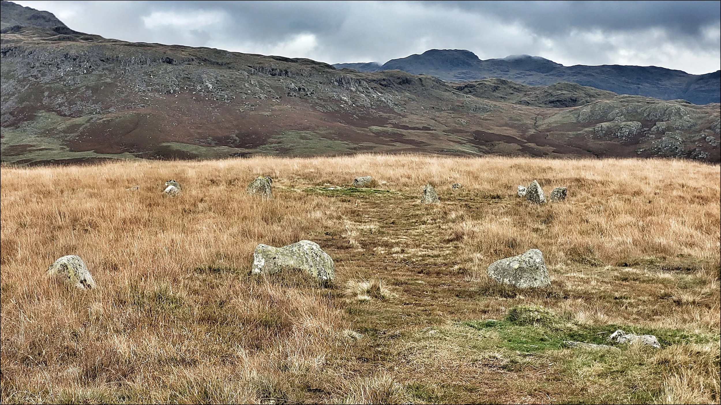 The footpath began at an old stone bridge next to a mill with a water wheel that was still working. It was a steep climb for about forty five minutes until it began to level off with fine views north east of Scafell Pike and behind us Harter Fell and the waterfall of Birker Force. It was only a short distance on when the path took us straight through the middle of the first circle, Brat’s Hill, with a rather scruffy layout of forty small to medium sized rounded stones forming a circle thirty metres across. The grass here was long and gave the structure an indistinct appearance. However at it’s centre was the unusual feature of five cairns all with small mounds, kerb stones and a sunken centre that may once have housed a cist. There were believed to be hundreds of cairns on Burnmoor so I climb up onto a nearby crag to scan the flat moorland around us. The view of Brat’s Hill was no better from here and I could see no sign of cairns, but two hundred metres off to the west was another circle raised up on a small ridge.