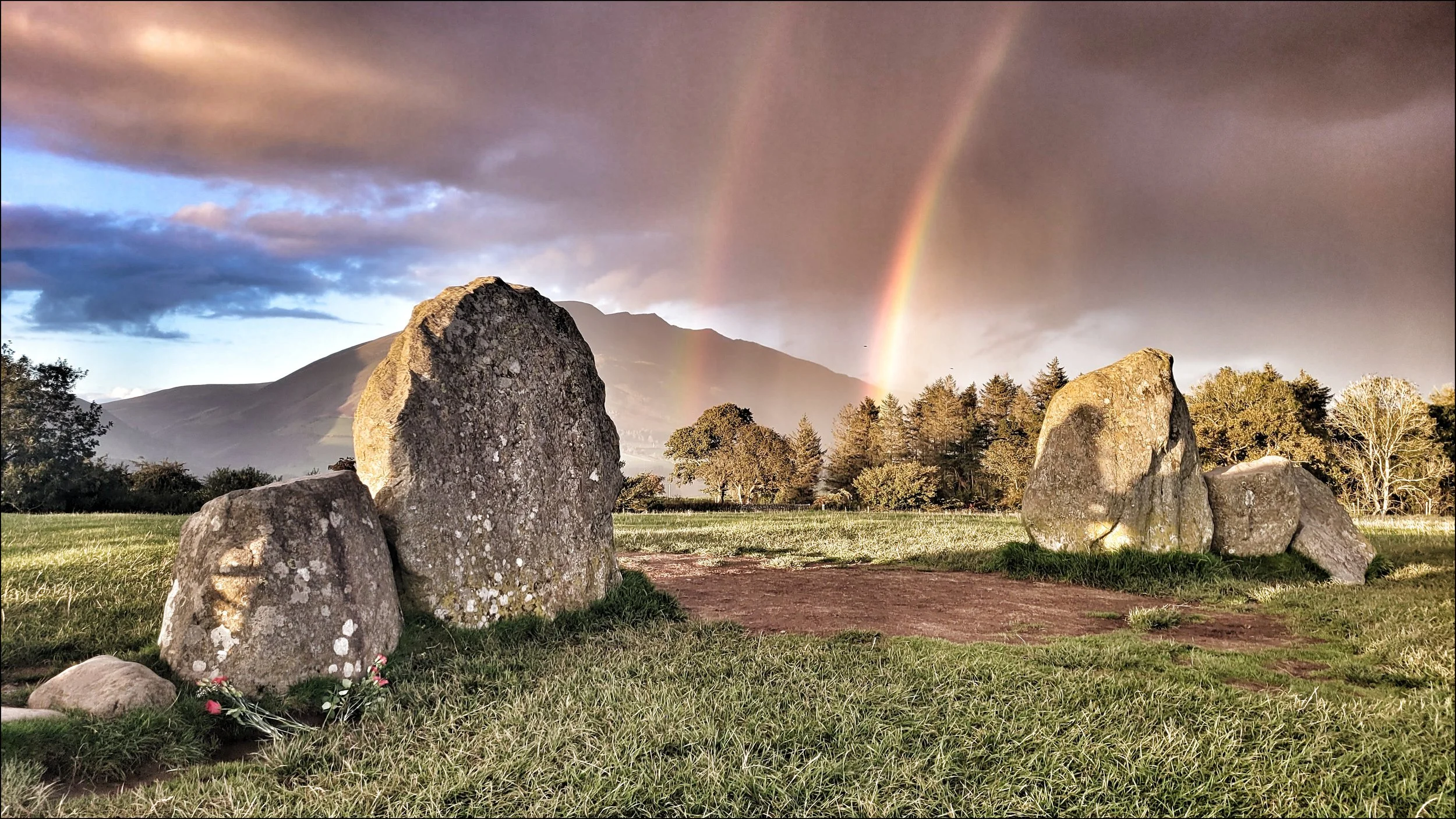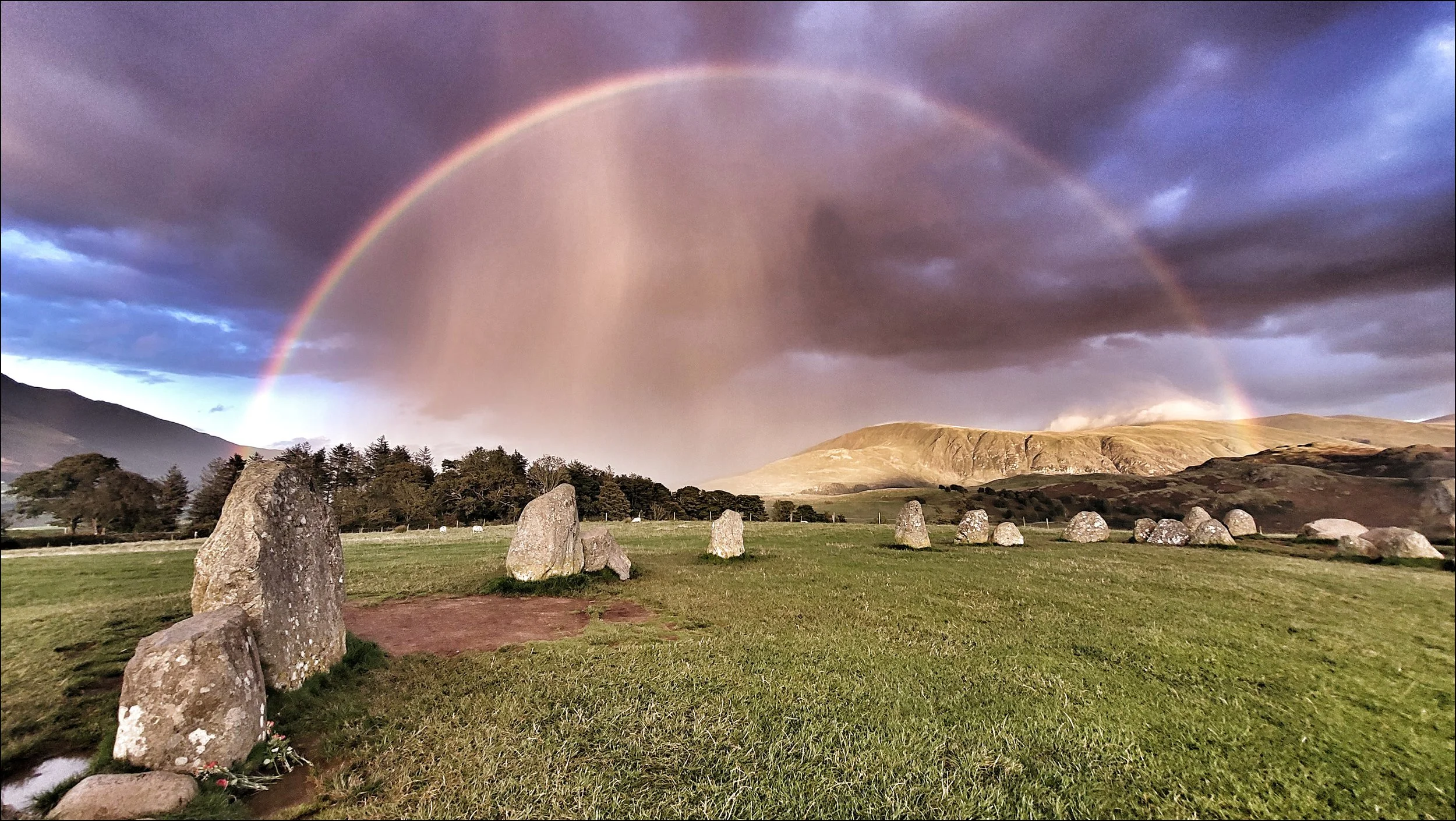 At close range the stones on the south eastern arc appeared to have an orangey green tinge and the yellow lichen cover had taken on a luminous quality. This circle like Long Meg and her Daughters dates back to the Neolithic and is one of the oldest in Britain, but unlike Long Meg it’s smaller diameter allows the eye to view it more completely and to feel it’s intensity at the centre. Of the thirty eight remaining stones, thirty three are still standing including those that make up an unusual rectangle feature just inside the eastern arc. Just as the sun was about to descend over the Derwent Fells a double rainbow appeared to the east. A local woman I met the following morning said this was a common occurance at that very same place. At the heart of the circle we toasted the setting sun with our horns of wine, tipping a little out for Castlerigg too.