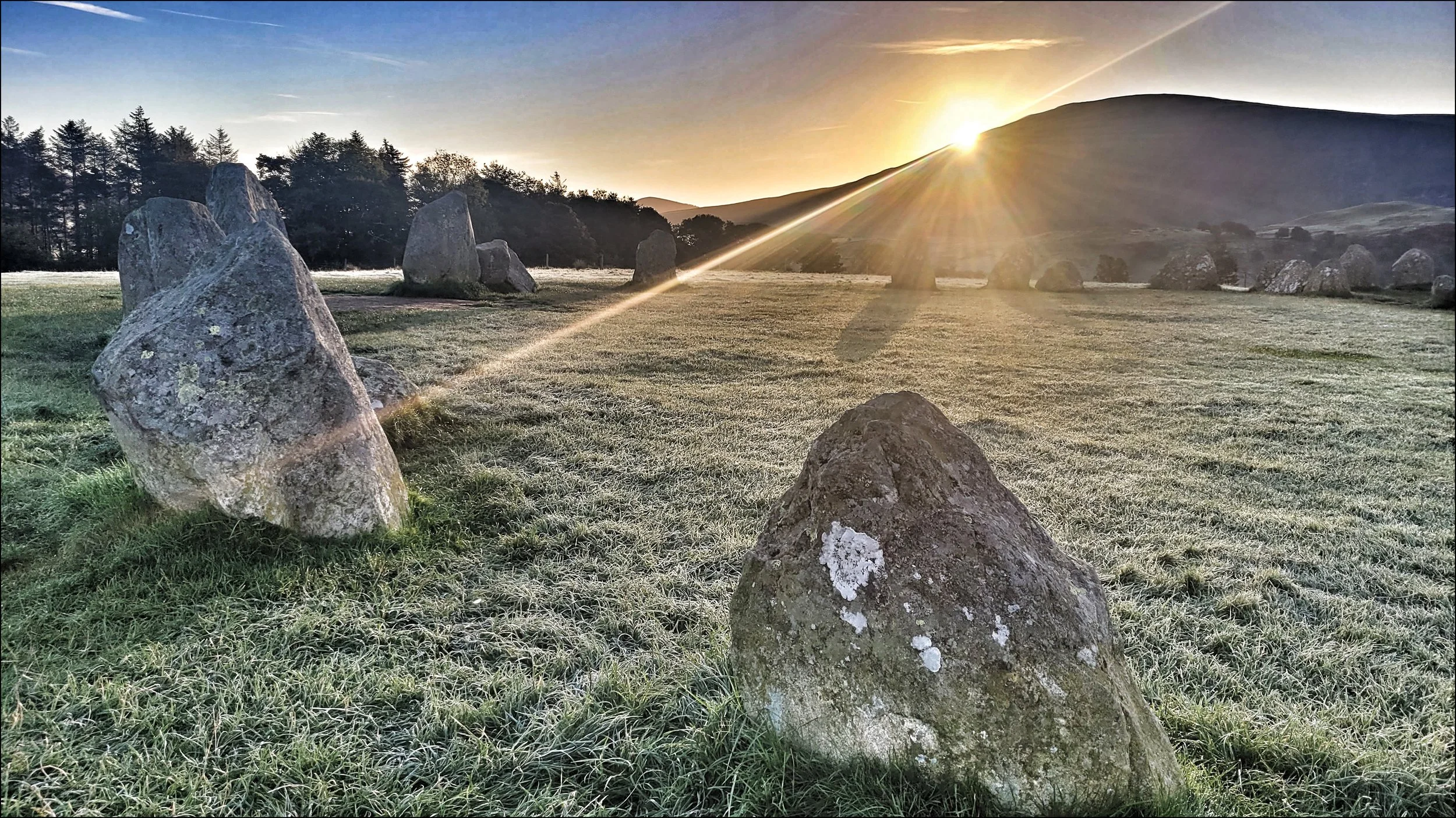 The next morning we were treated to another natural spectacle. At first light Castlerigg was encircled by a low mist that hugged the ground down to Thirlmere and Helvellyn. There was a good crowd present to witness the sunrise which took a while to appear over Clough Head. A number of photographers had set up ready outside the circle and inside most stood still in expectation. The surrounding fells began to catch the light and then suddenly the stones lit up and took shape. As the long shadows formed the land began to warm and the low mist began to disappear.