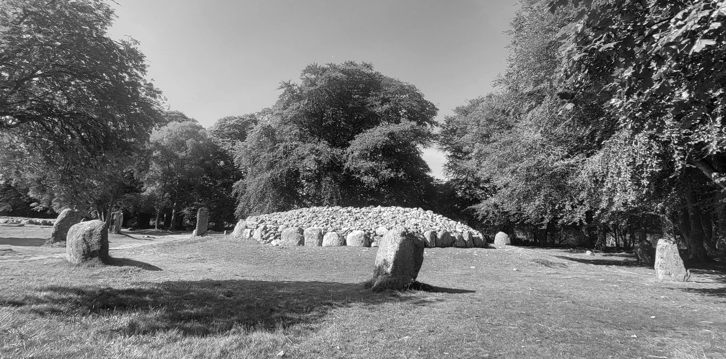 Three large low-lying cairns built around 2000BC make up this burial site. Each of the passage graves is encircled by a ring of standing stones. Two of the three cairns have chambers now open to the sky with interior walls of neatly stacked monochromatic stones. It is likely the well manicured surroundings will alter the development of lichen growth over the years ahead.
