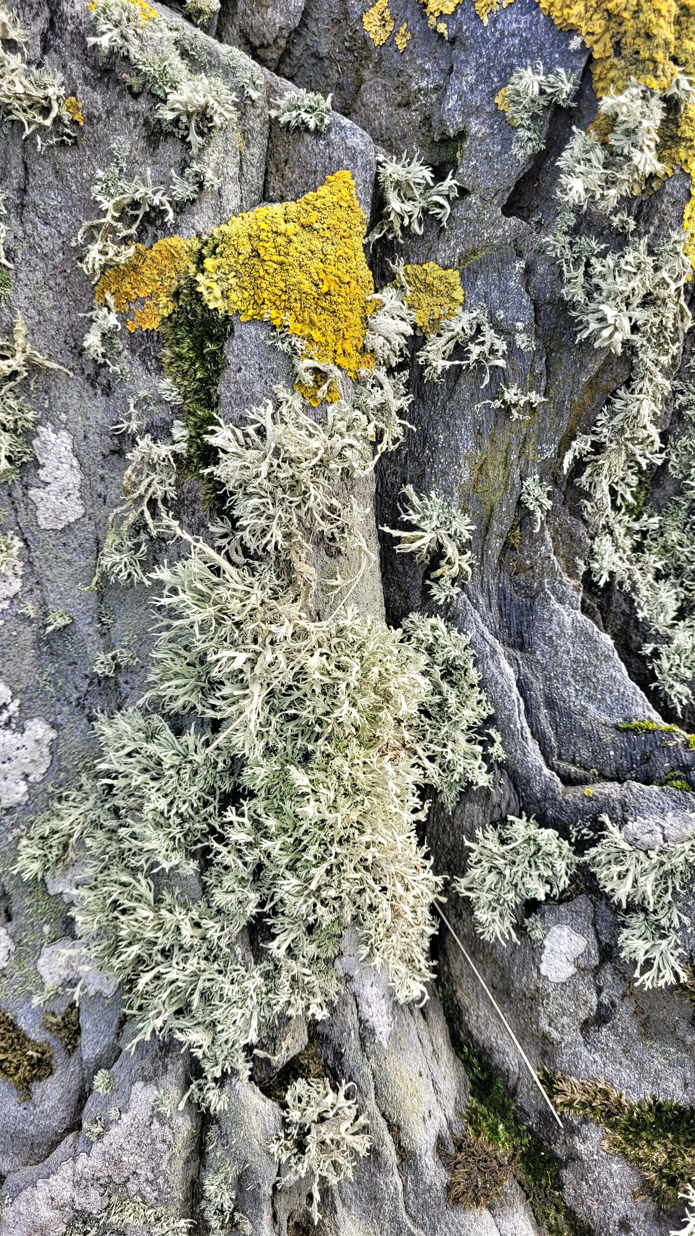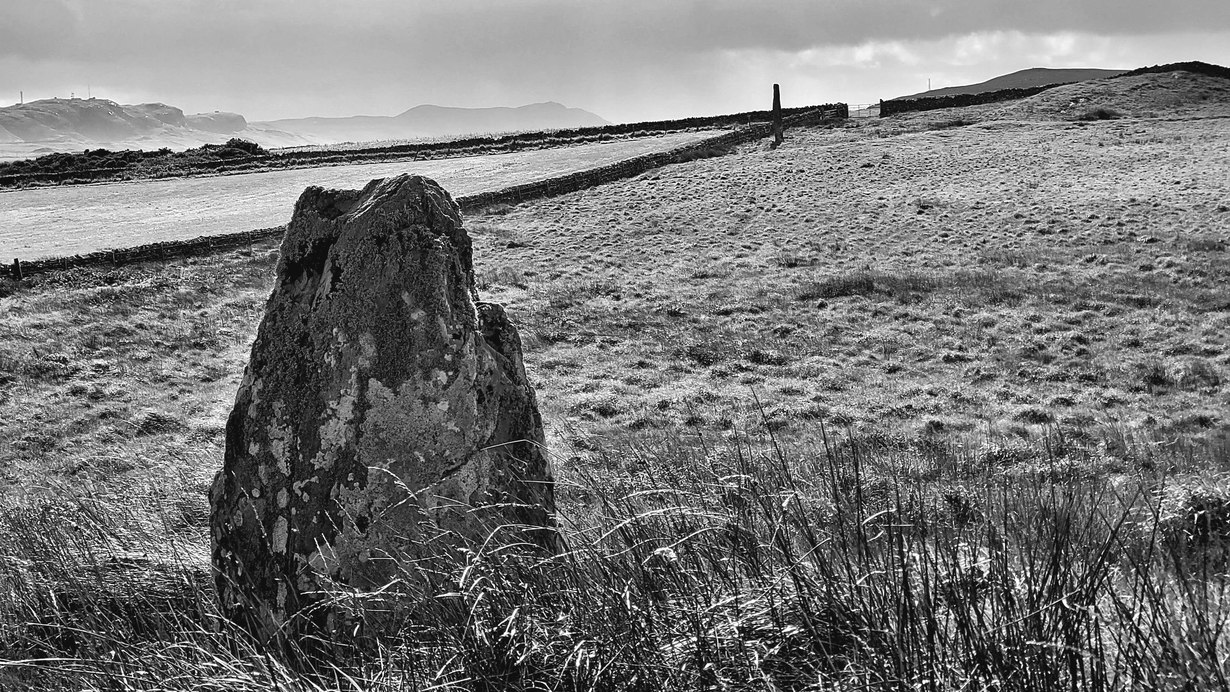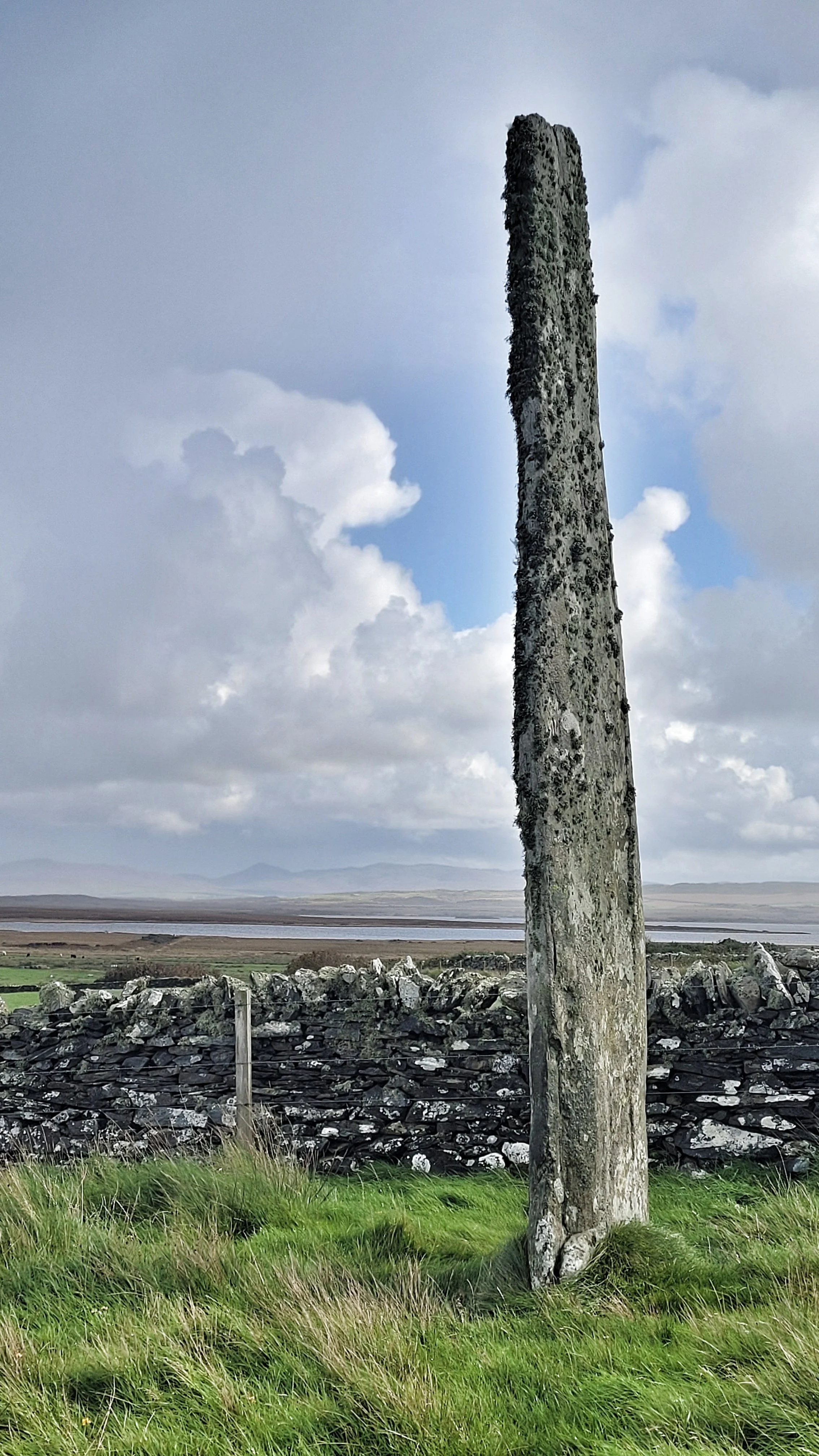The two uprights of this Stone Row are two hundred metres apart and very different in character. Whilst the northern stone is now just a one metre high stump, the other reaches the dizzy height of five metres with a slender, elegant profile. Not far from the north shore, the salty air has encouraged the growth of small clumps of fruticose lichen on the upper half of both stones.