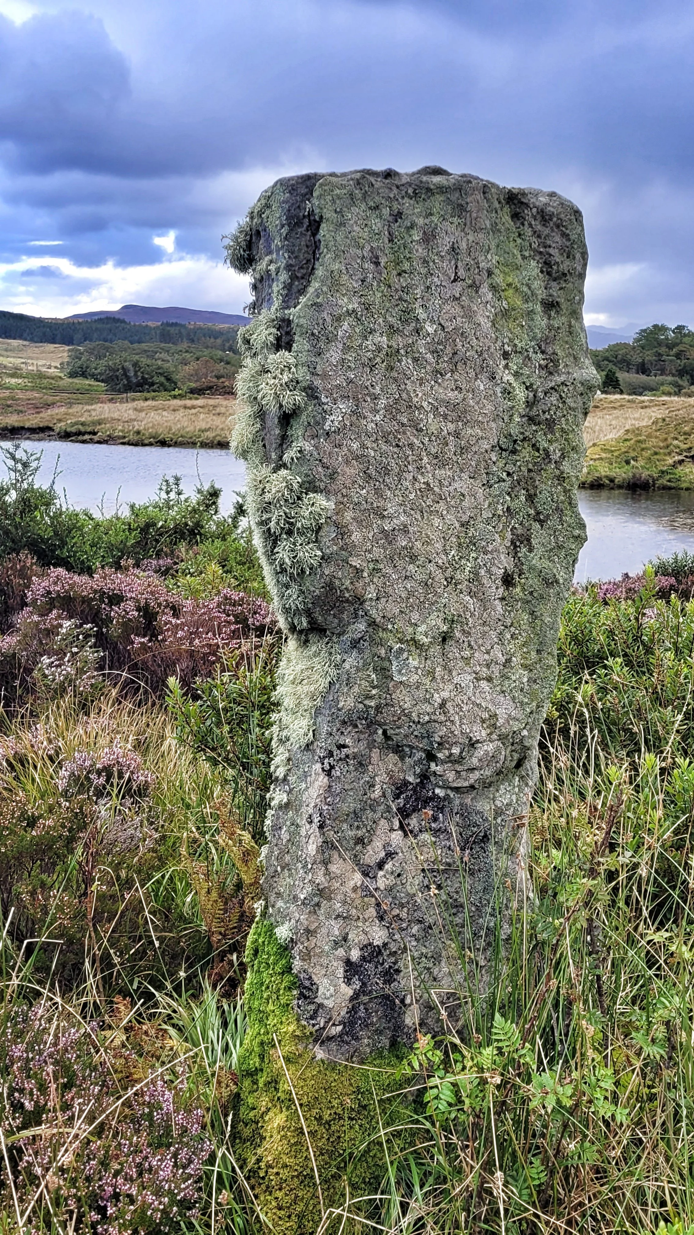 Some of the more remote sites around Scotland are difficult to get to. This circle has no path to it and is only accessible by wading across a small but fast flowing stream. Among the heather is a fallen fourth stone. The colours on the surface of the stones seem to reflect the colours of the landscape and flora around them.