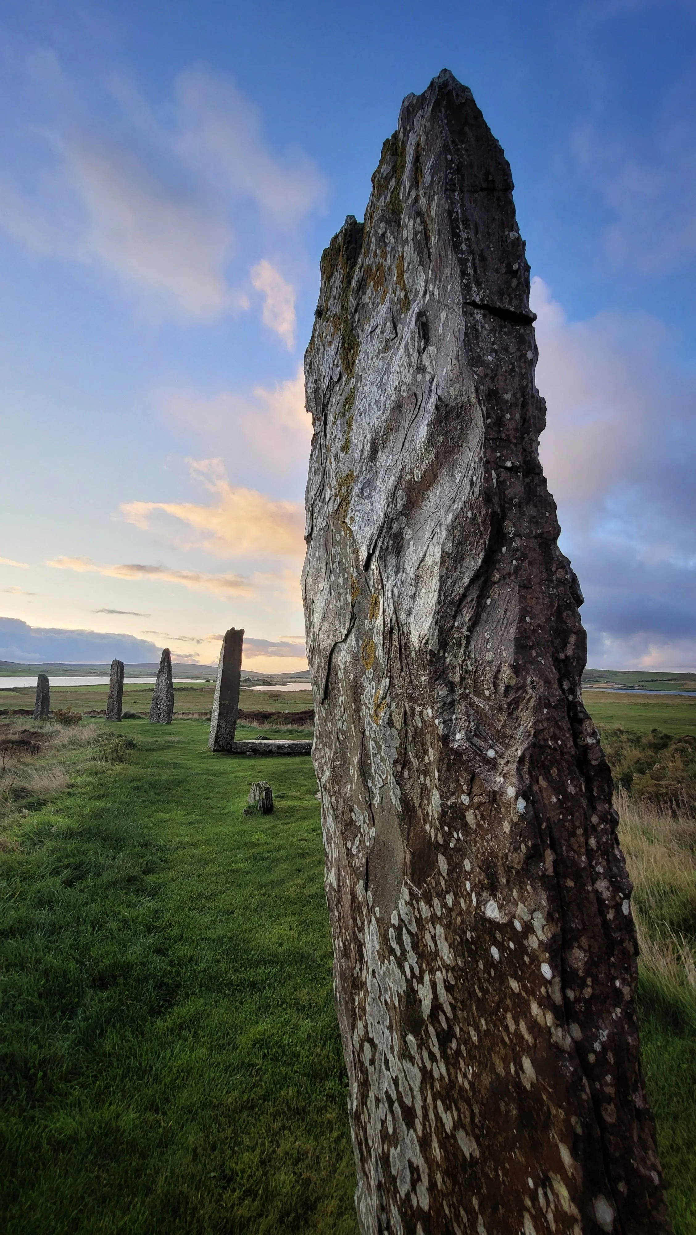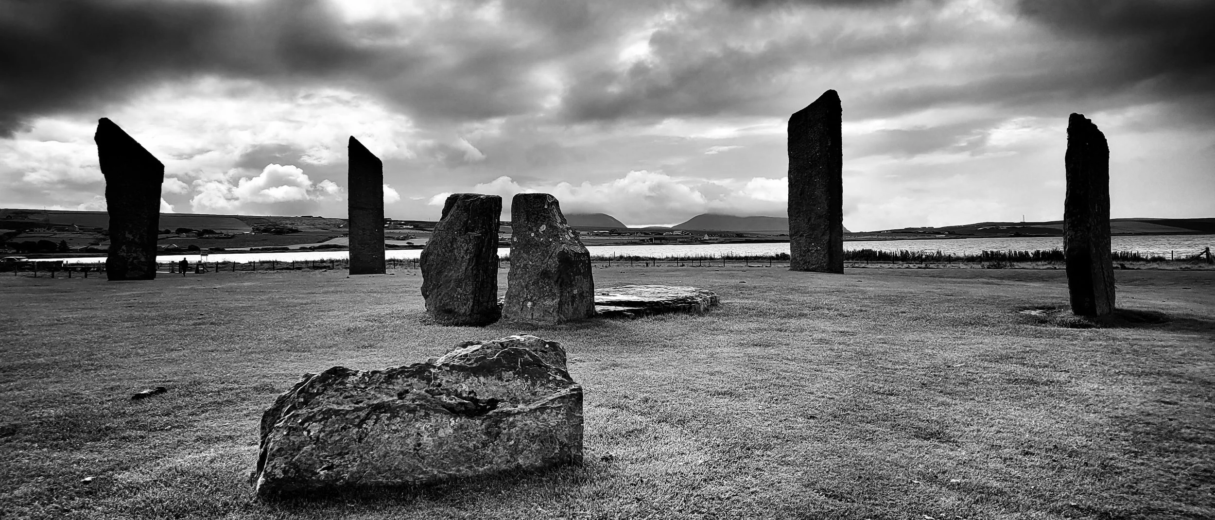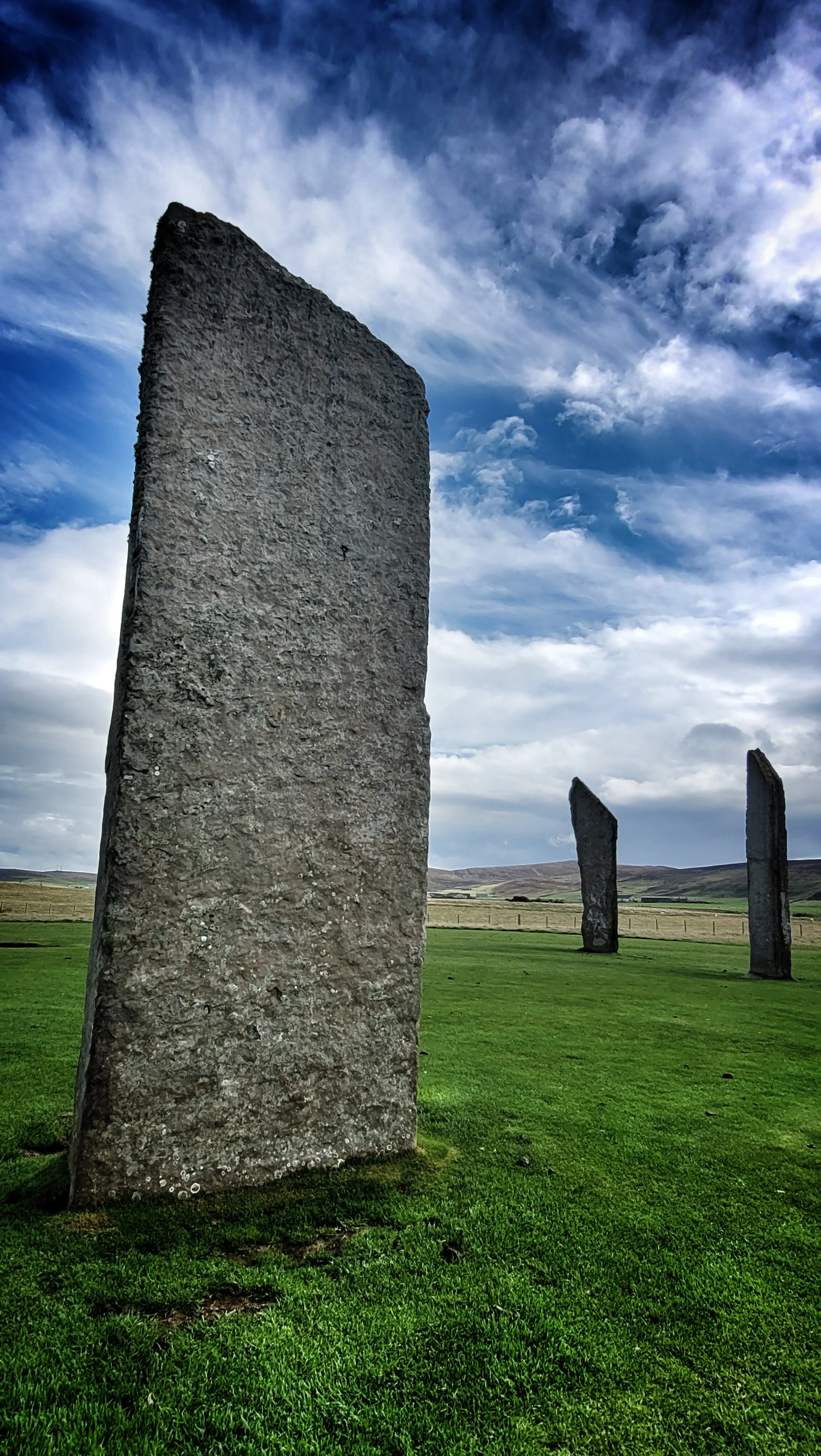 Set in a commanding position between the Loch of Stenness and the Loch of Harray, four large stones remain standing from the original twelve, with an altar stone complex at its centre. Unlike nearby Brodgar weathering and lichen growth has been curiously minimal, with these stones being some of the oldest in neolithic Britain.