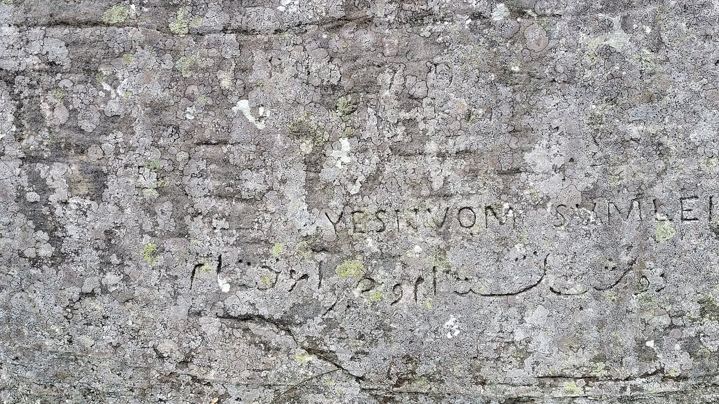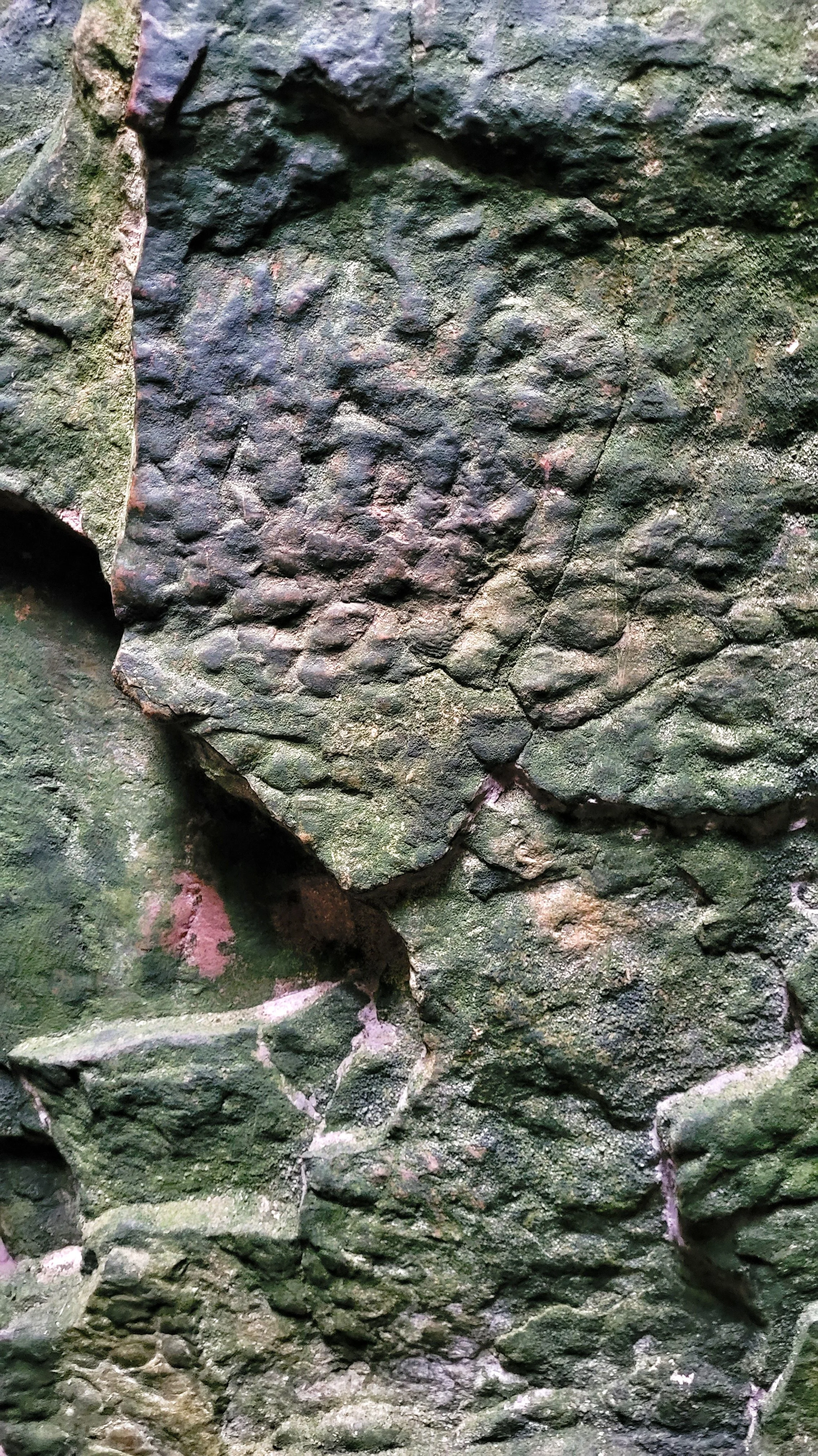 This unique burial chamber is made from one single slab of sandstone. The exterior grey colour is tinged with pink and has a covering of white crustose and Black Spot lichen. The damp interior has developed an additional green complexion. Many stones from this period have acquired graffiti over time. Latin and Arabic inscriptions can be seen on its southern side.